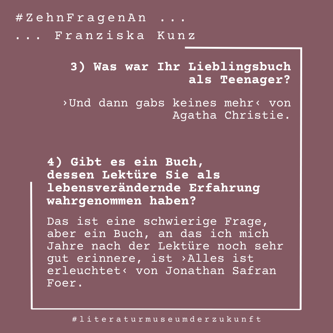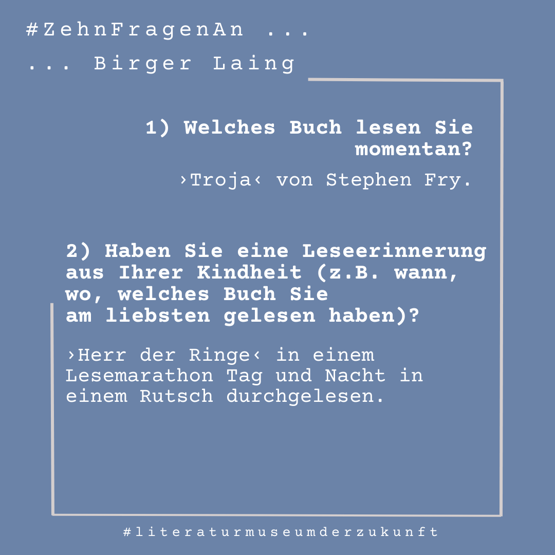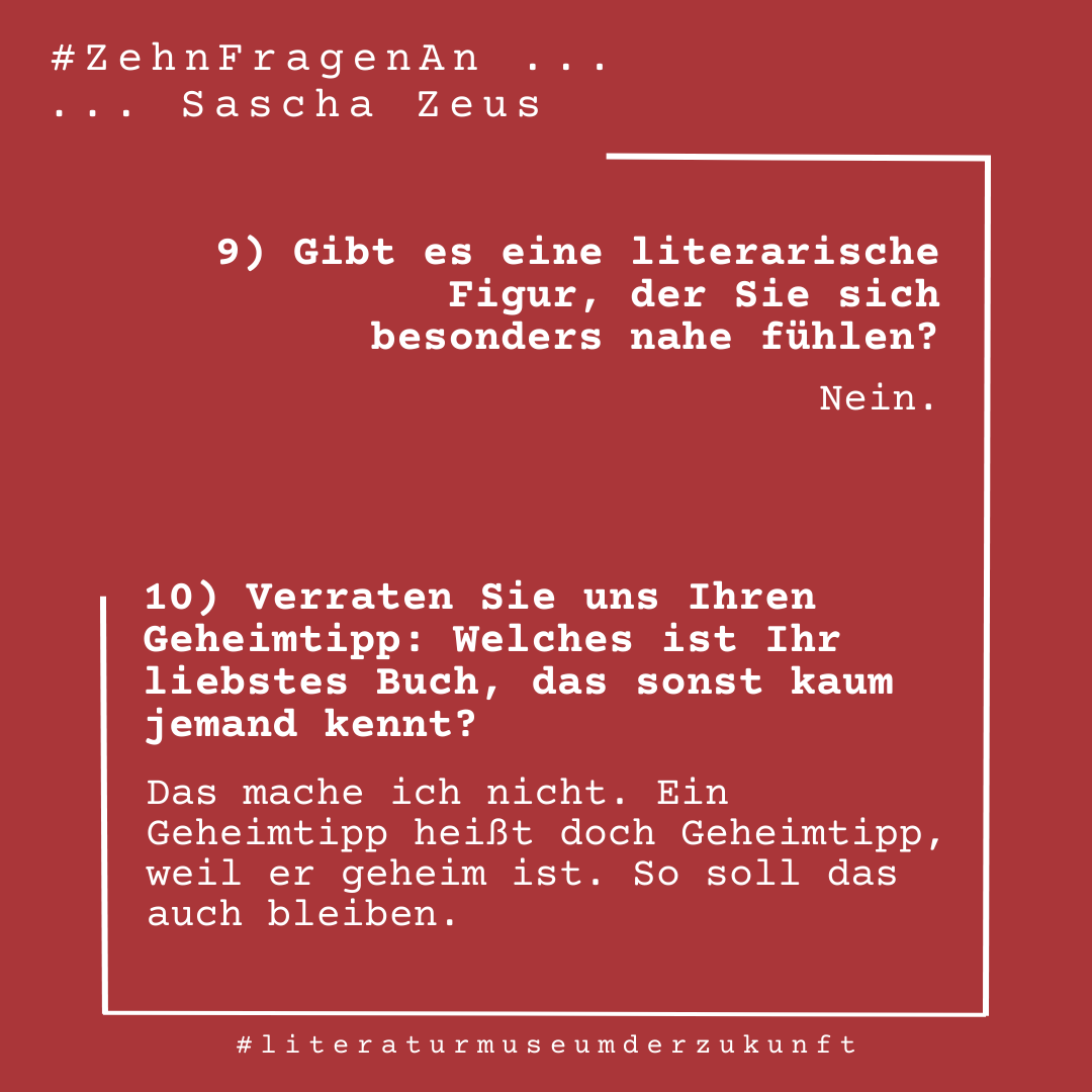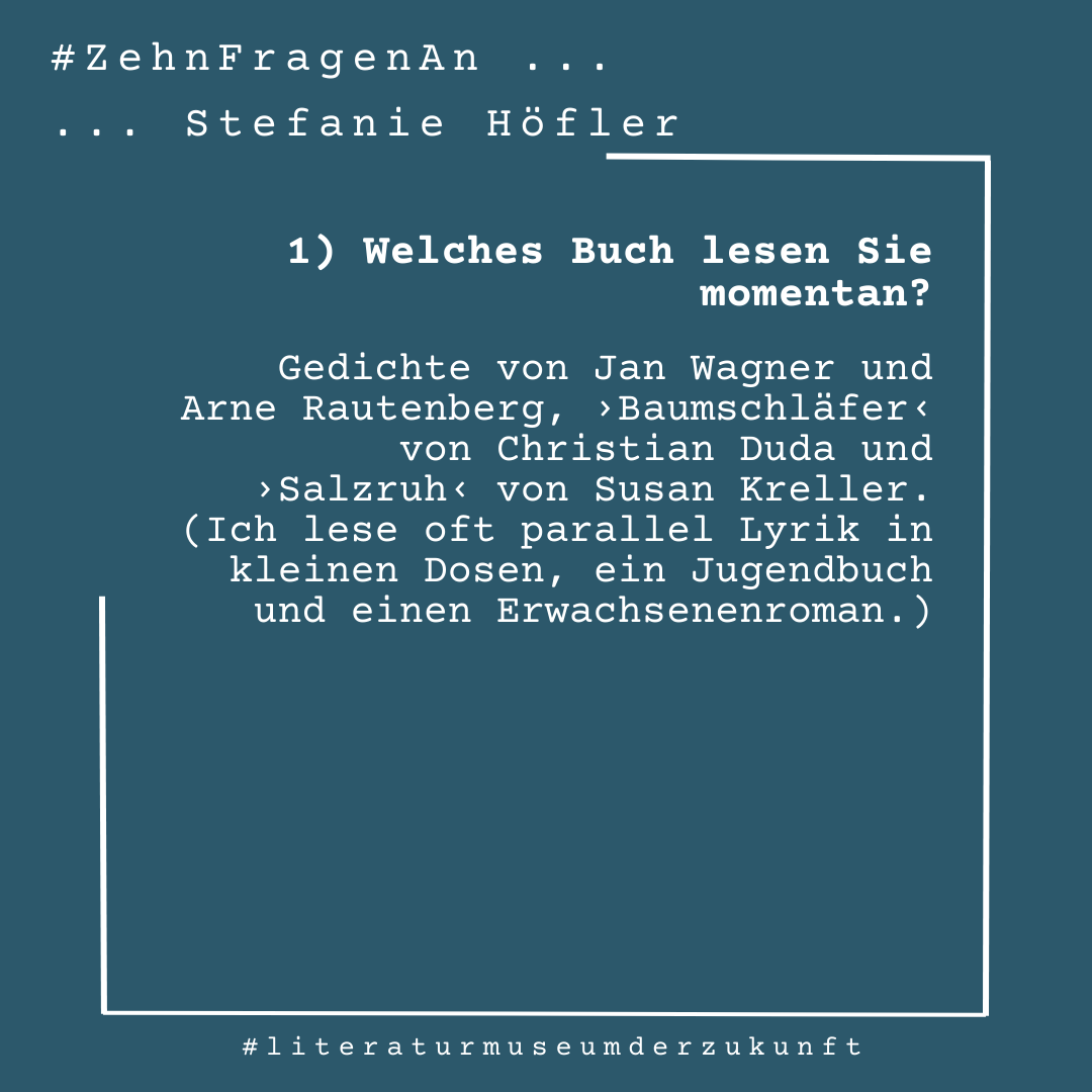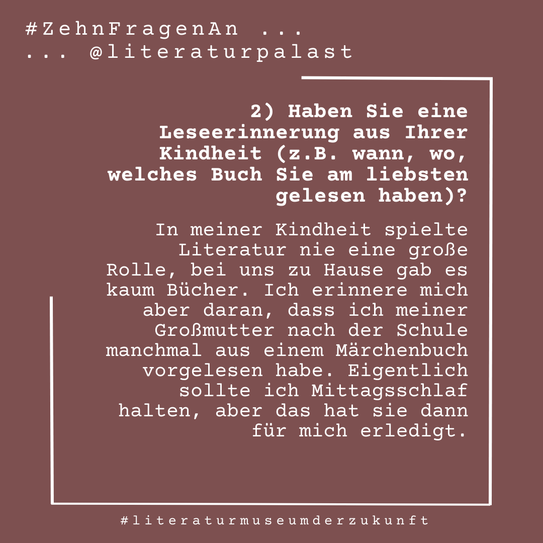 #zehnfragenan: Was ist Literatur und in welchen Formen, Formaten und Situationen ist sie für jede/n Einzelne/n persönlich wichtig? Wir reden mit interessanten Menschen über’s Lesen und Schreiben – und darüber, welche Rolle Literatur in unserem Leben einnimmt. Indem wir verschiedene Stimmen zu Wort kommen lassen, wollen wir uns gemeinsam der Antwort nähern, was Literatur heute und morgen für uns alle bedeuten kann.