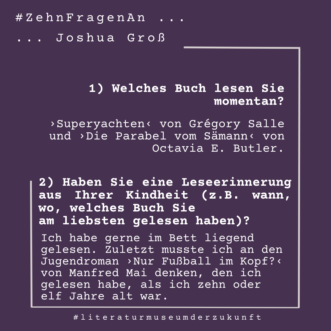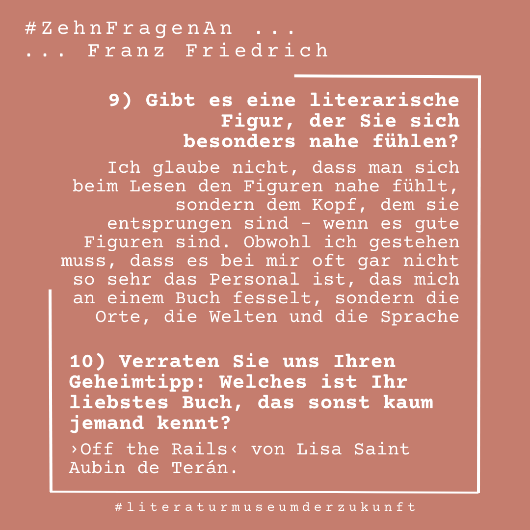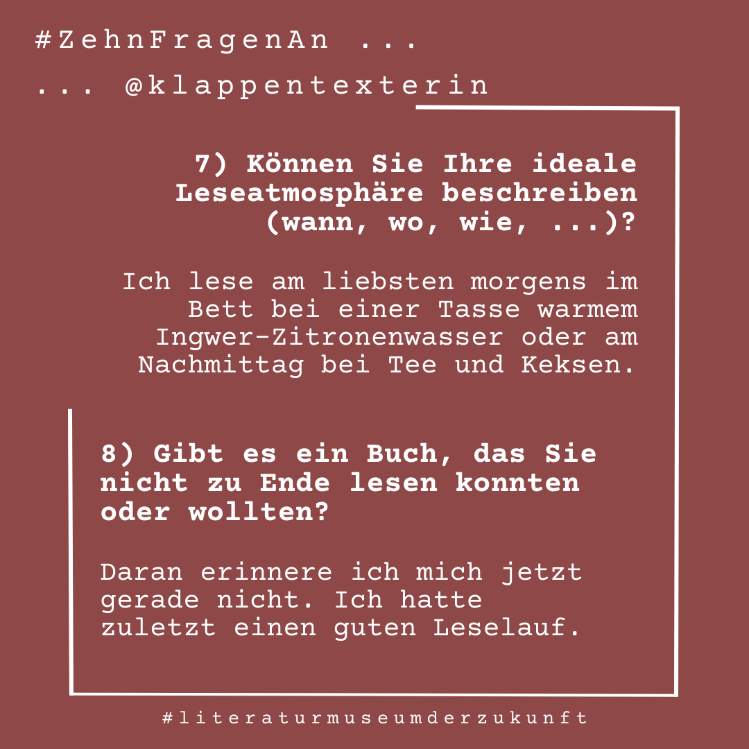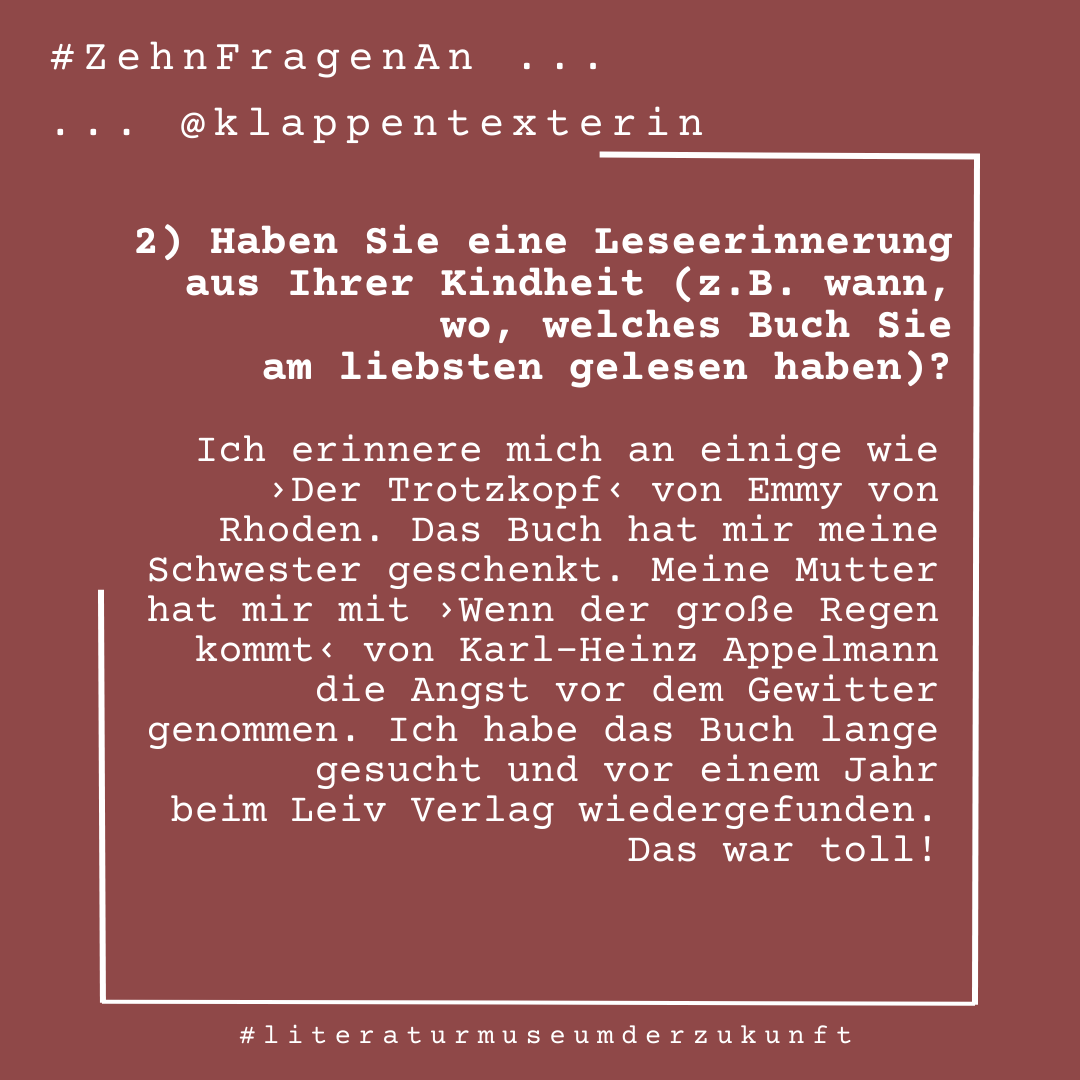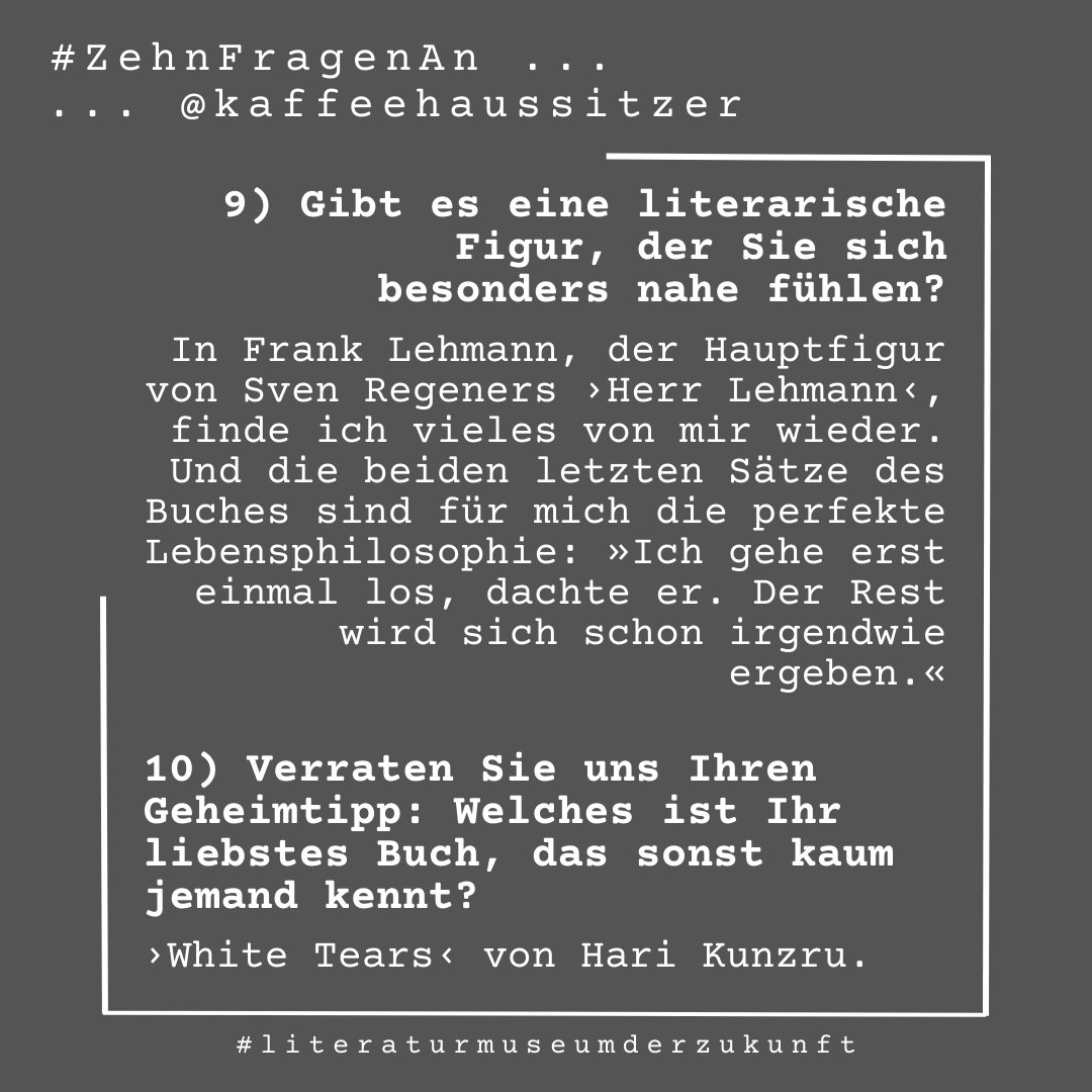 #zehnfragenan: Was ist Literatur und in welchen Formen, Formaten und Situationen ist sie für jede/n Einzelne/n persönlich wichtig? Wir reden mit interessanten Menschen über’s Lesen und Schreiben – und darüber, welche Rolle Literatur in unserem Leben einnimmt. Indem wir verschiedene Stimmen zu Wort kommen lassen, wollen wir uns gemeinsam der Antwort nähern, was Literatur heute und morgen für uns alle bedeuten kann.