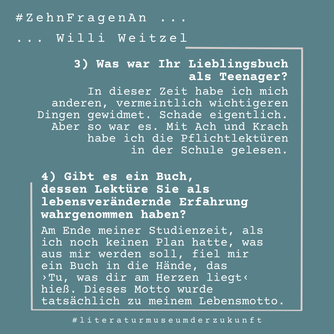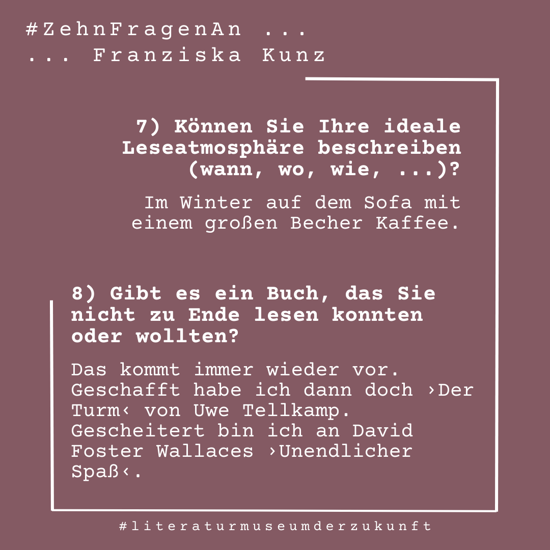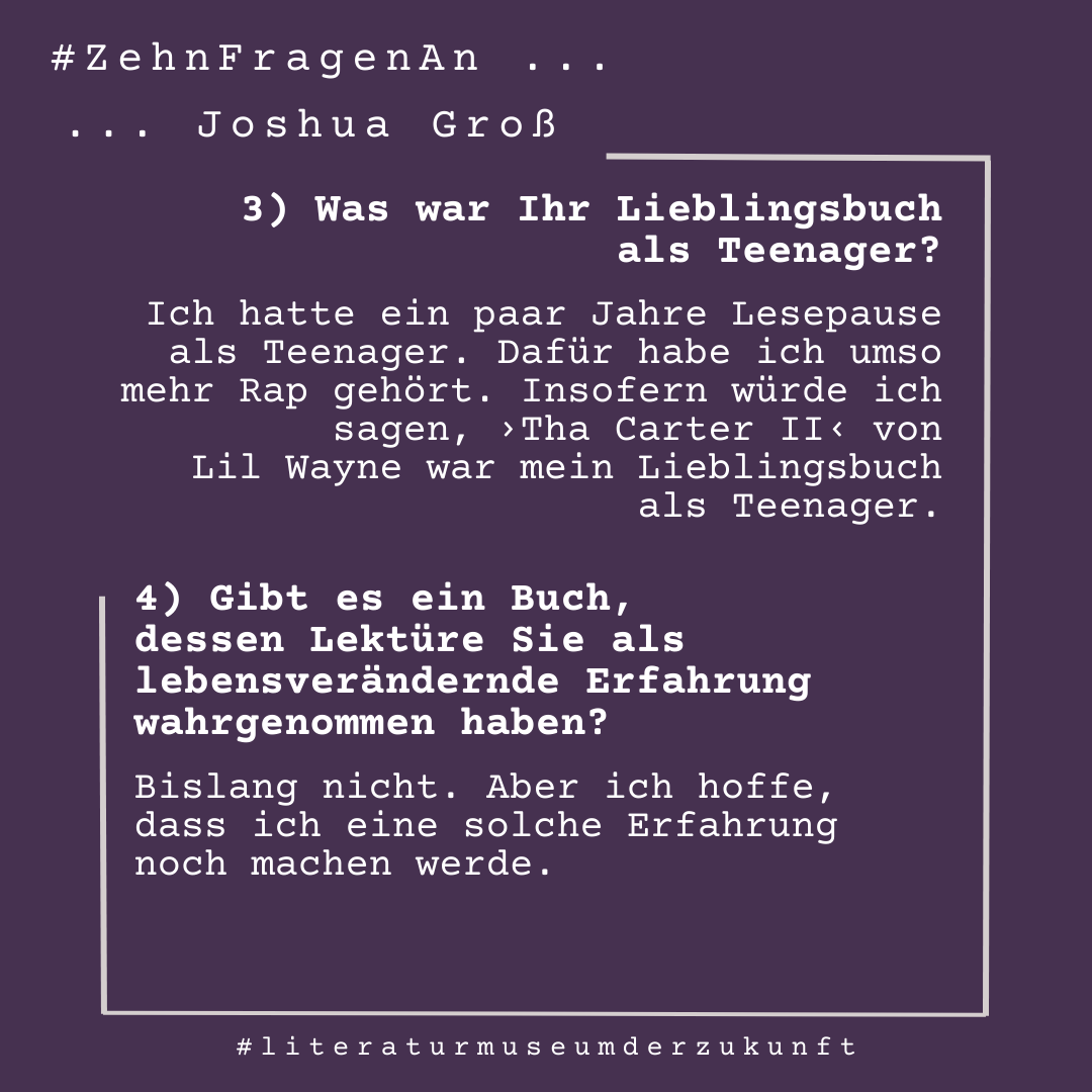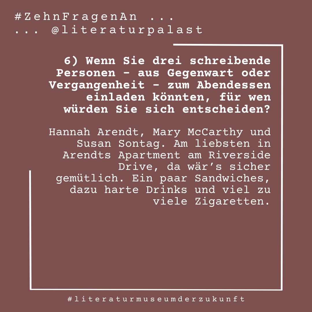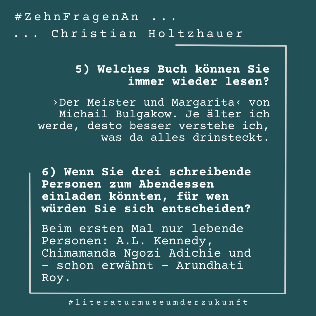 #zehnfragenan: Was ist Literatur und in welchen Formen, Formaten und Situationen ist sie für jede/n Einzelne/n persönlich wichtig? Wir reden mit interessanten Menschen über’s Lesen und Schreiben – und darüber, welche Rolle Literatur in unserem Leben einnimmt. Indem wir verschiedene Stimmen zu Wort kommen lassen, wollen wir uns gemeinsam der Antwort nähern, was Literatur heute und morgen für uns alle bedeuten kann.