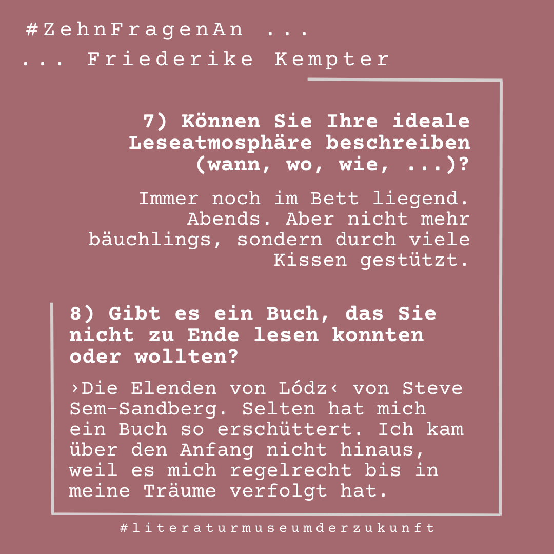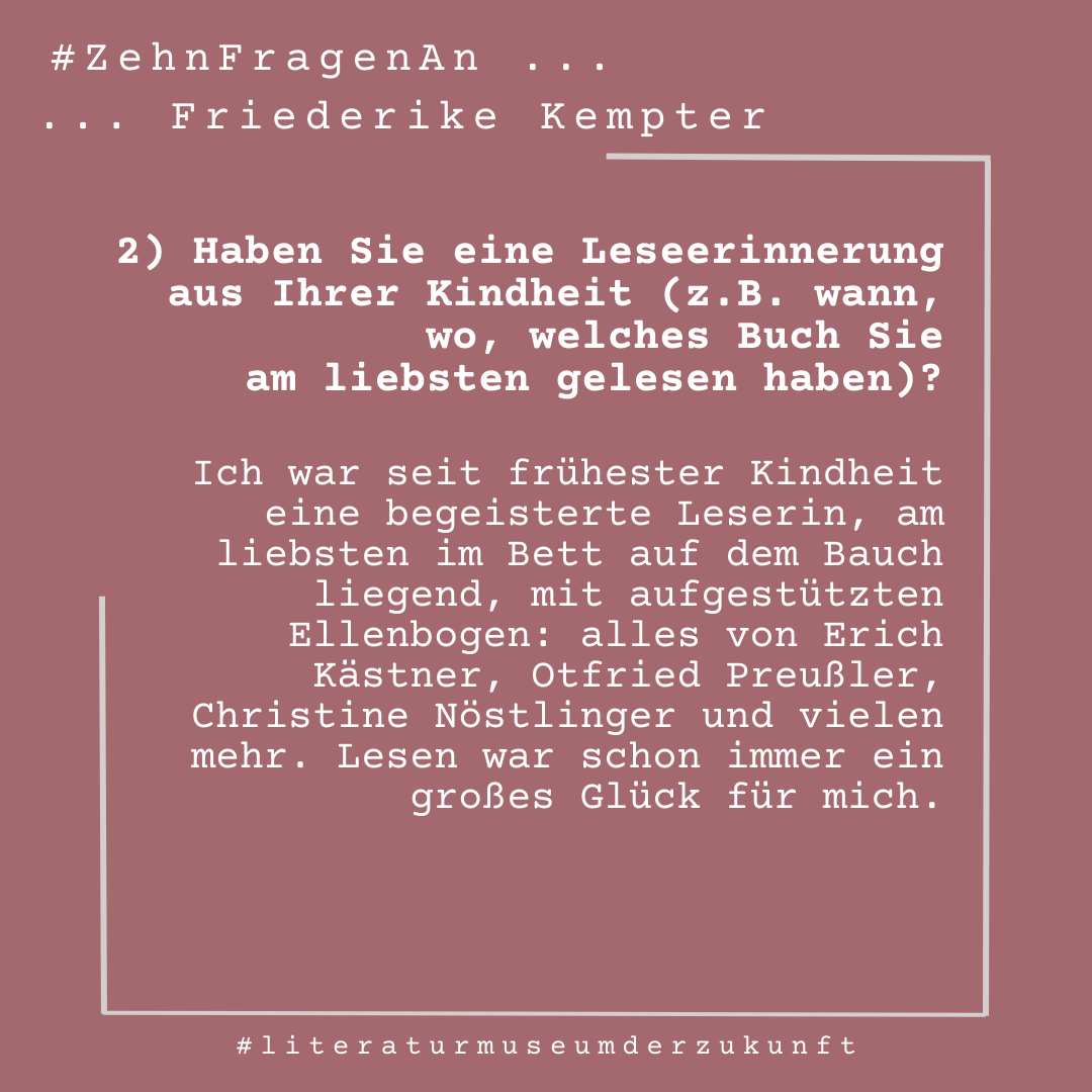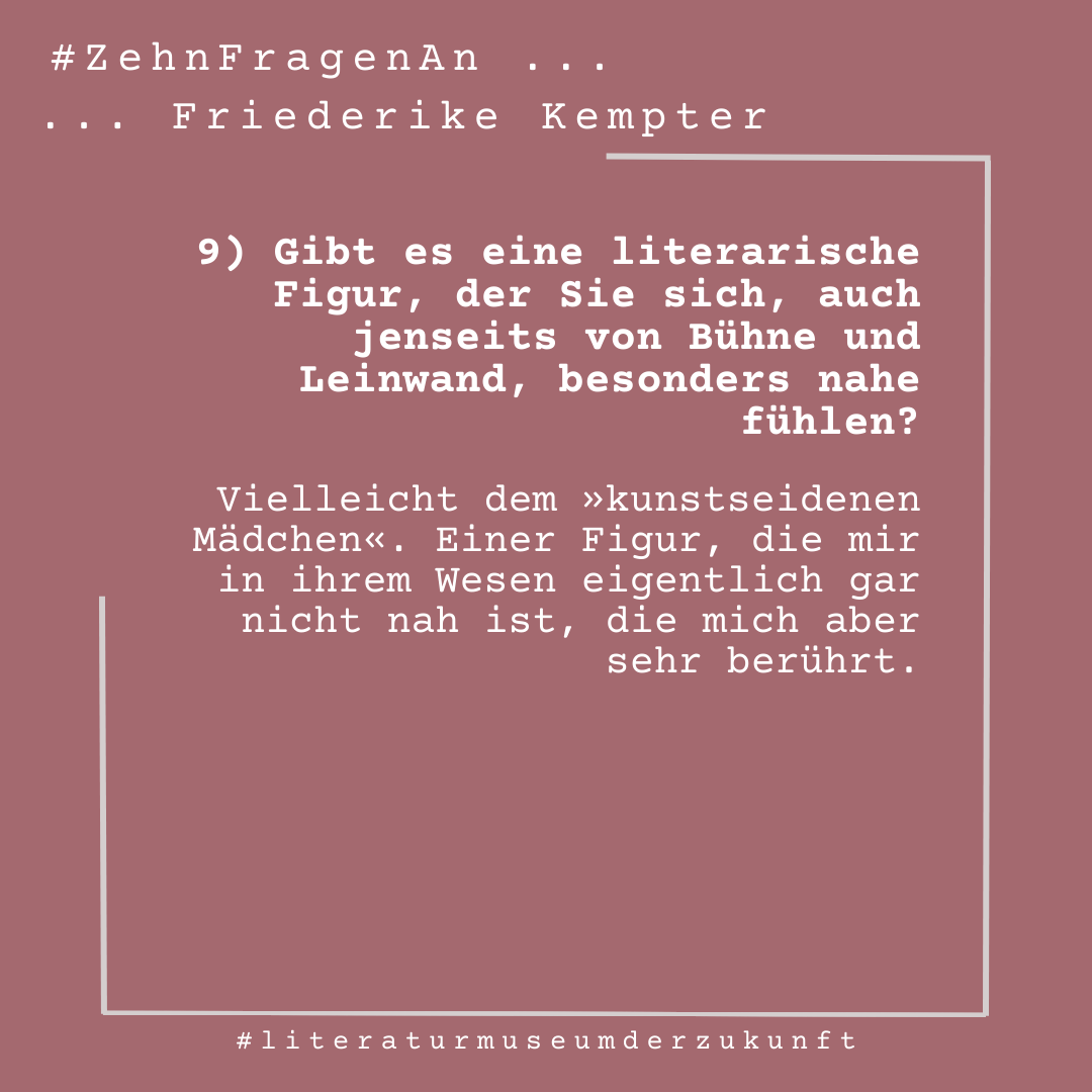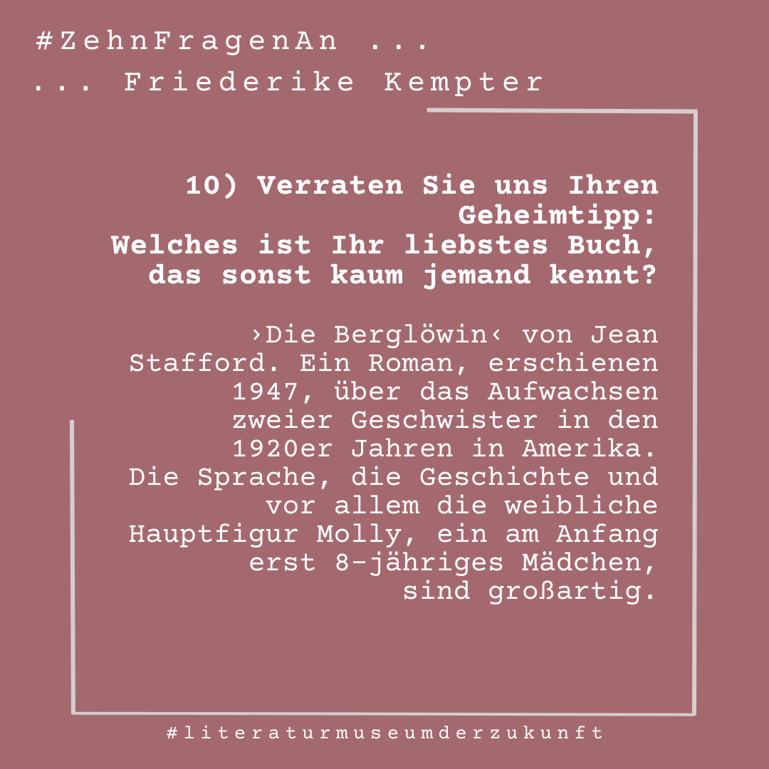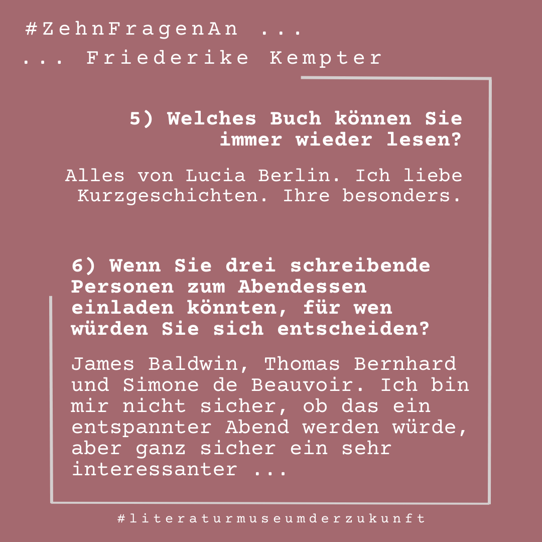 Eigentlich stellt sie lieber selbst die Fragen. Zum Beispiel in ihrer Dokureihe „Friederike klopft an“, in der sie Geschichten von mutigen und selbstbestimmten Frauen erzählt. Umso mehr freuen wir uns, dass sie heute unsere zehn Fragen beantwortet. Wer kommt zu Ihrer literarischen Dinner Party, Frau Kempter? [FriederikeKempter]