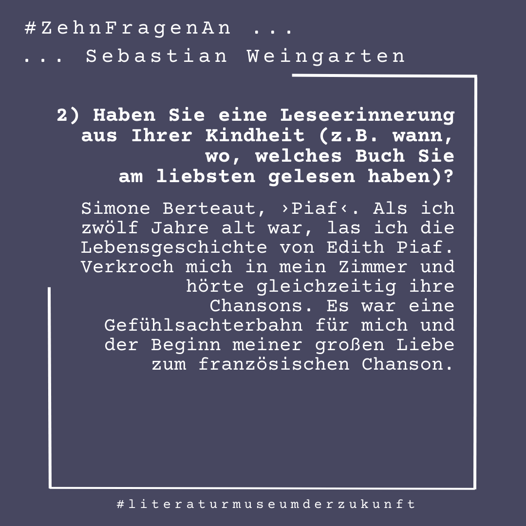 Passend zur coronabedingt verschobenen Jubiläumsausstellung im Stadtpalais Stuttgart kommt heute Sebastian Weingarten zu Wort, Schauspieler und langjähriger Intendant des Theaters. Wann ging das los mit der großen Liebe zum französischen Chanson – und welche (Theater-)Autor:innen sind Ihnen wichtig, Herr Weingarten? [SebastianWeingarten]