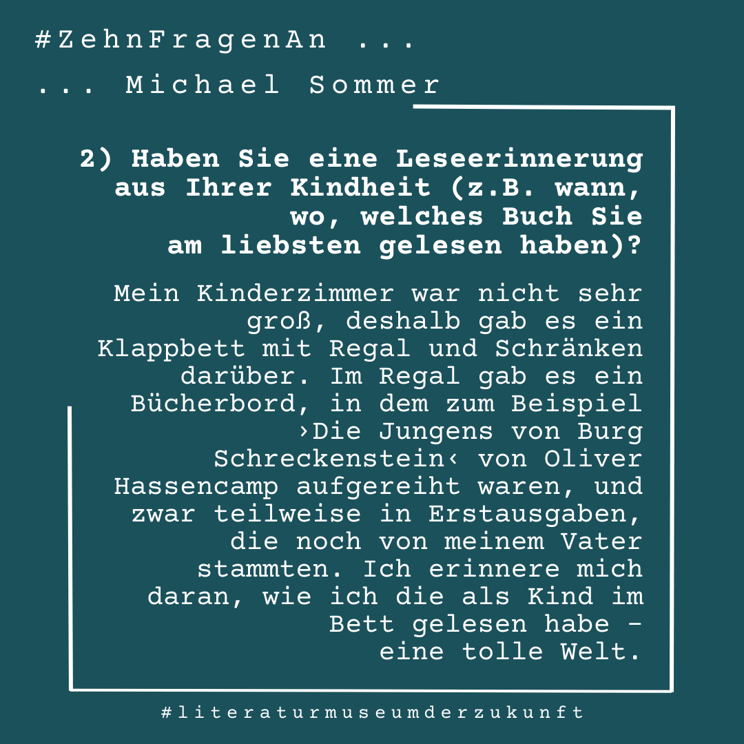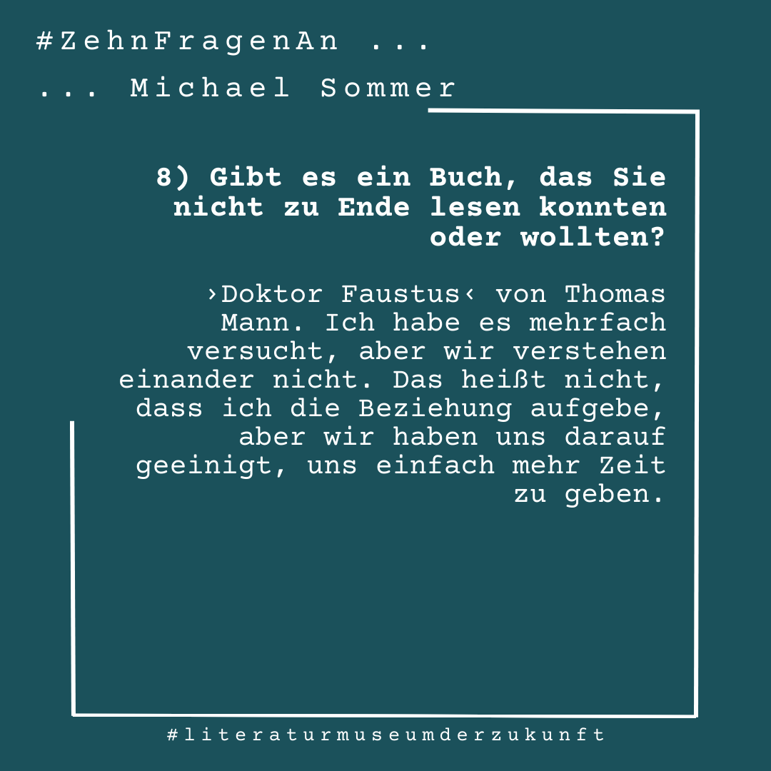 Literatur ist schön, aber leider zu lang, ist sein Motto. Deswegen gibt es seit 2015 seinen YouTube Kanal SOMMERS WELTLITERATUR TO GO, wo er einmal wöchentlich mit Hilfe seines Playmobilensembles ein Werk der Weltliteratur in maximal zehnminütigen Videos zusammenfasst. Was lesen Sie privat, Herr Sommer, wenn’s mal nicht verfilmt werden muss? [MichaelSommer]