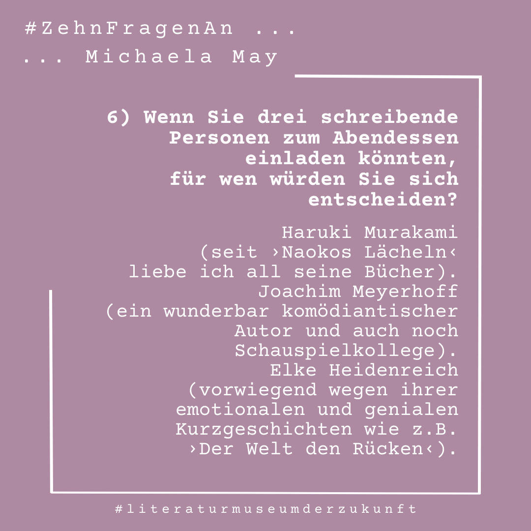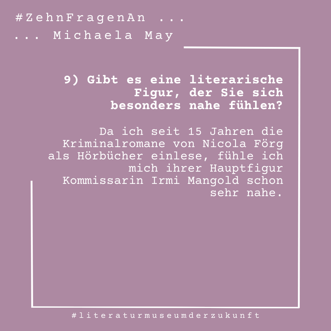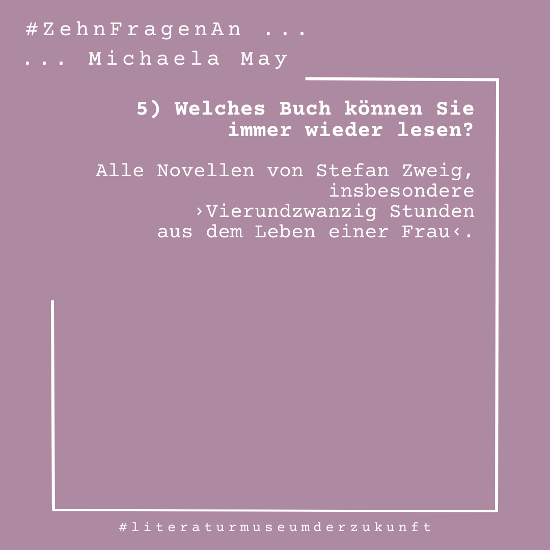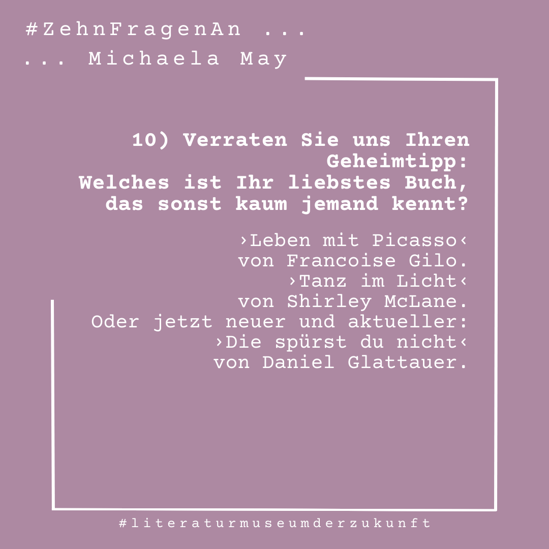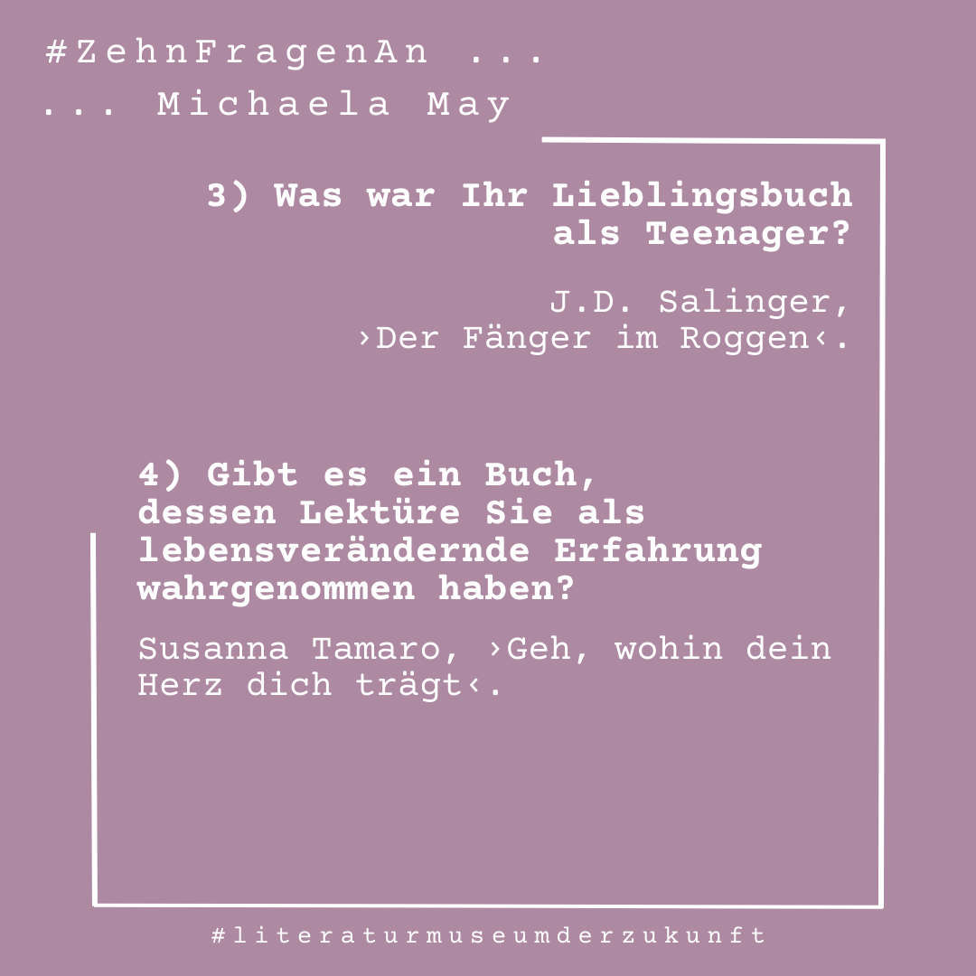 Seit den 1960er Jahren ist Michaela May aus der deutschen Film-, Fernseh- und Theaterlandschaft nicht wegzudenken. Und sie ist Schirmherrin des Vereins ‚Retla‘ (‚Alter‘ rückwärts gelesen; https://retla.org/): Sie setzt sich dafür ein, das Älterwerden vorwärtsgewandt zu denken, den Umgang mit älteren Menschen in unserer Gesellschaft zu verändern und neue Perspektiven für das Alter zu schaffen. Was war Ihr liebstes Buch als Teenager, Frau May? [MichaelaMay]