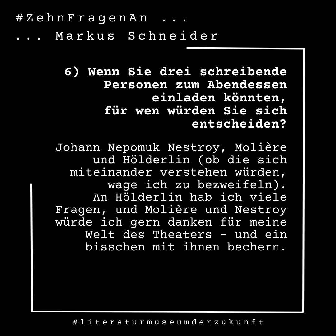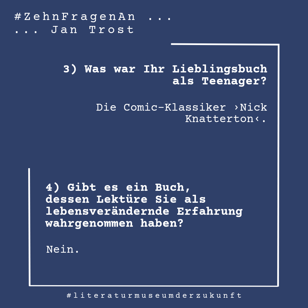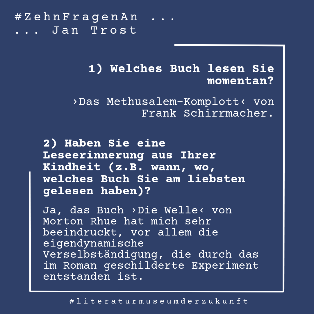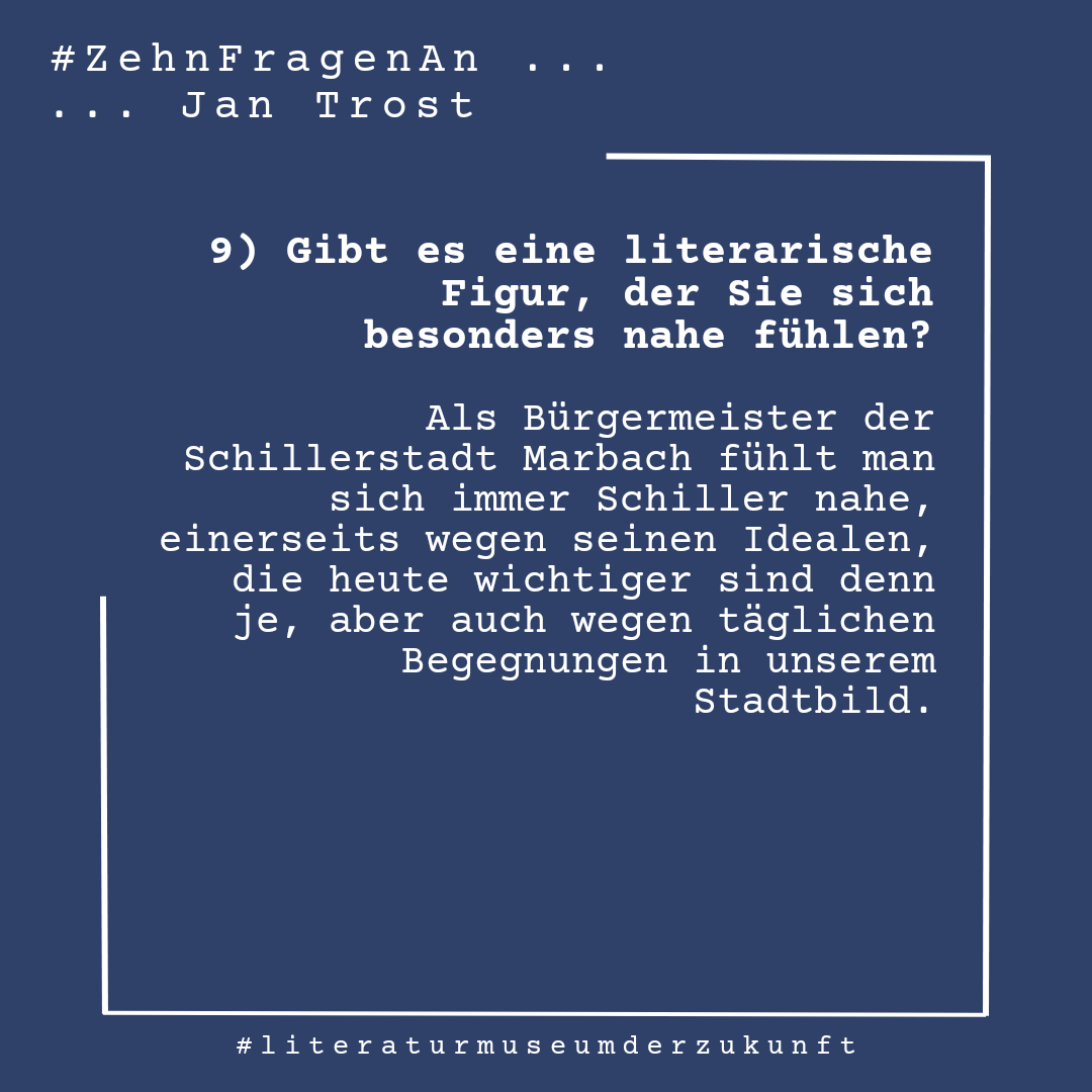 Friedrich Schiller ist dem Bürgermeister der Schillerstadt Marbach besonders nahe – jeden Tag, ideell und ‚real‘. Schiller wäre auch ein gern gesehener Gast beim Abendessen, zusammen mit Régis Debray und Thomas Schulz. Welches Buch hat Sie in Ihrer Kindheit besonders beeindruckt und warum, Herr Trost? [JanTrost]