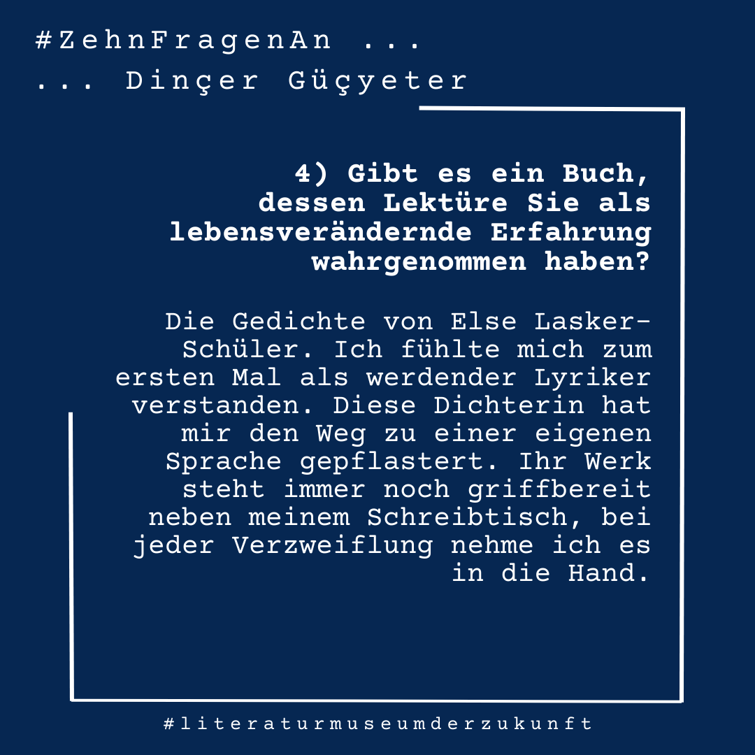 Else-Lasker-Schüler-Fan. Else-Lasker-Schüler-Preisträger. Verleger unwahrscheinlicher Lyrik seit 2011. Festival-Organisator (https://www.nettetal.de/leben-nettetal/veranstaltungen/weltliteratur-im-ghetto-ein-lesefest). Und Pommesbuden-Kenner. Welchem Buch wünschen Sie Millionen von Leser:innen, Herr Güçyeter? [DinçerGüçyeter]