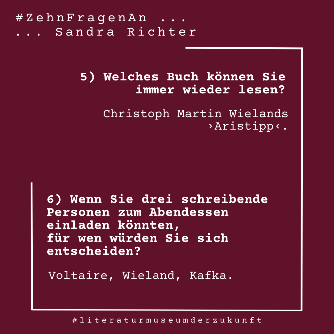 Seit der Schulzeit hat sie sich mit franzö-sischer Literatur beschäftigt, später „Eine Weltgeschichte der deutschsprachigen Literatur“ geschrieben und mit „Lob des Optimismus“ eine ganze Lebenskunst erforscht. Seit 2019 leitet sie das Deutsche Literaturarchiv. Zu ihrem idealen literarischen Abendessen kommt im Kafka-Jahr natürlich the man himself – aber wer ist außerdem noch geladen, Frau Richter? [SandraRichter]