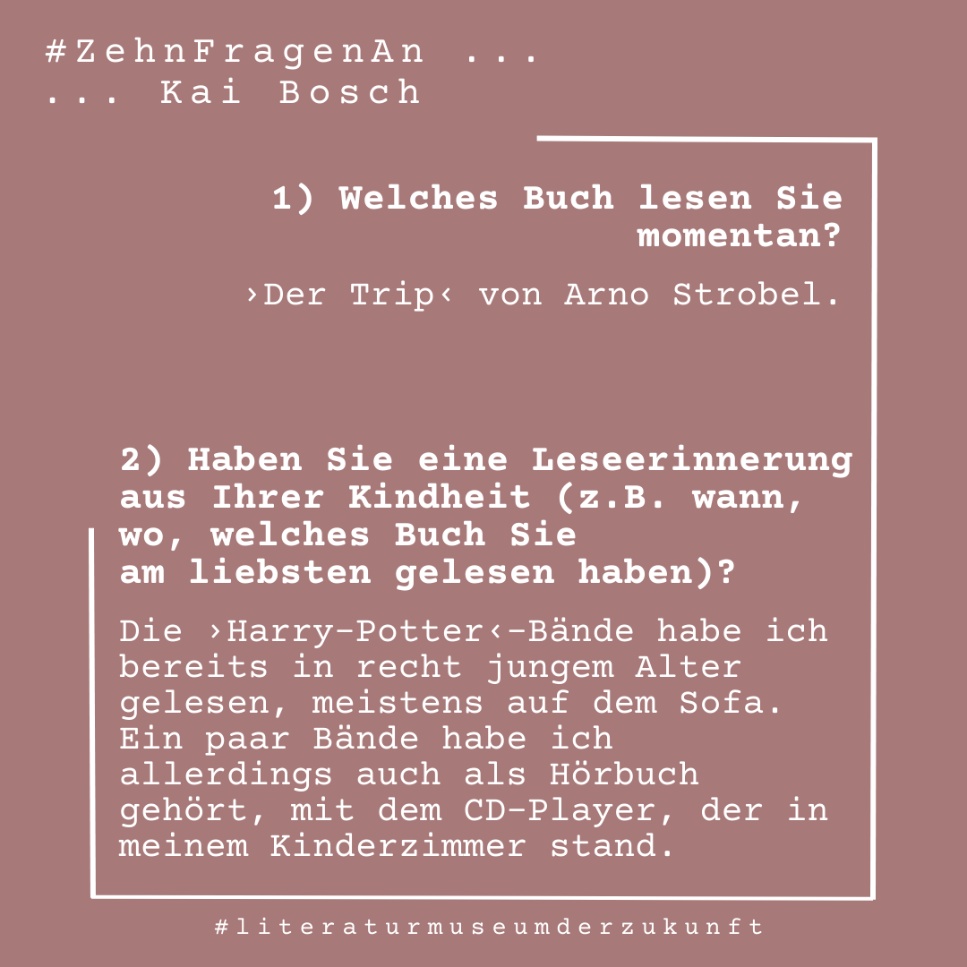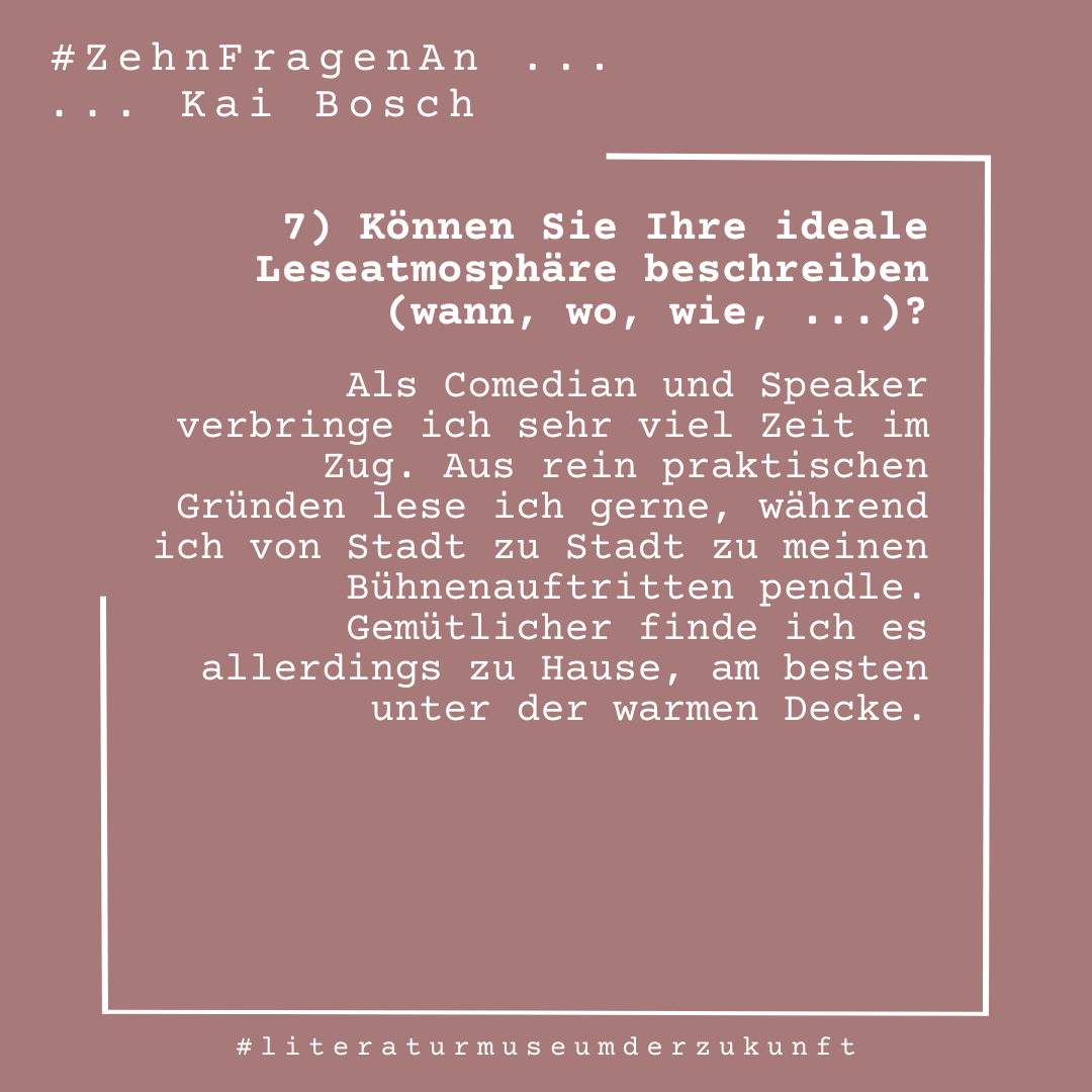 Er ist Stotternder, Tetraspastiker, Sprech- und Sprachtrainer, Poetry Slammer und Förderpreis-träger des Baden-Württembergischen Kleinkunst-preises. Kreativität, rhetorisches Geschick und Humor zeichnen seine Bühnenshows und seine Workshops aus. Seit welcher Lektüreerfahrung stellen Sie sich öfter die Frage „Erfüllt mich der heutige Tag?“, Herr Bosch? [KaiBosch]