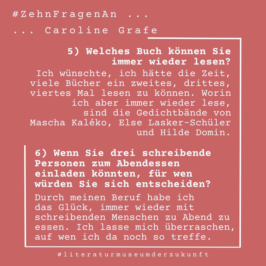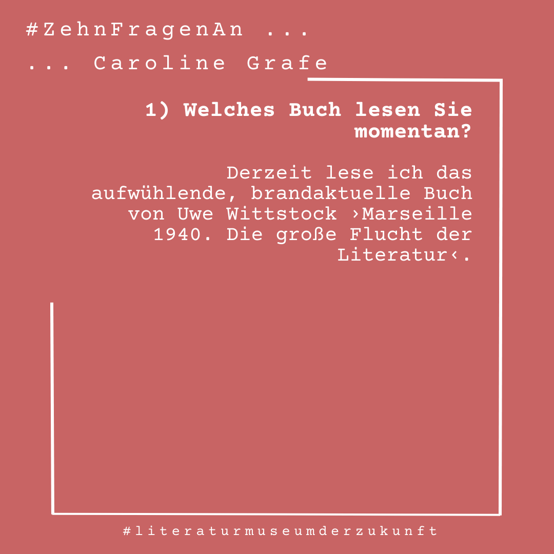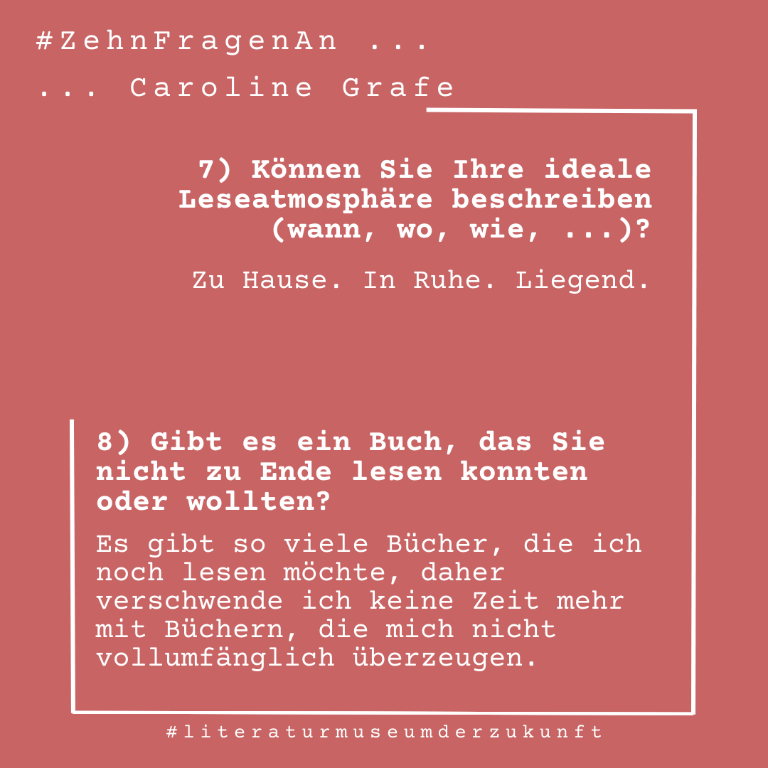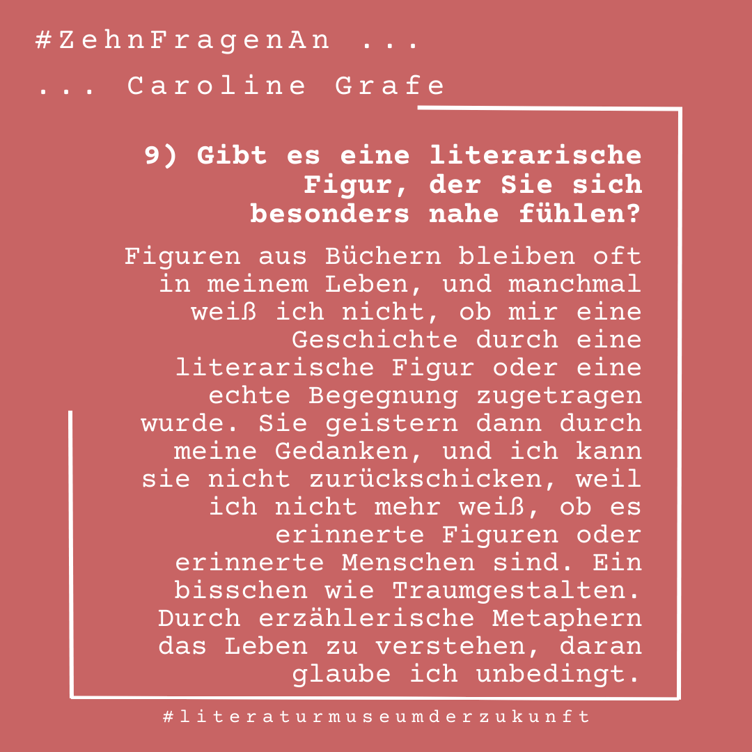 Bücher brauchen Breitenwirkung und jemanden, der sich für sie einsetzt: Das tut Caroline Grafe mit ihrem Büro für Text und Literaturvermittlung litquartier, mit Lektorat, Moderation, Autor*innenberatung, -coaching oder Live-Buchvorstellungen auf Instagram (@litquartier). Welchen zwei Literaturdebüts der letzten Jahre wünschen Sie größere Aufmerksamkeit, Frau Grafe? [CarolineGrafe]
