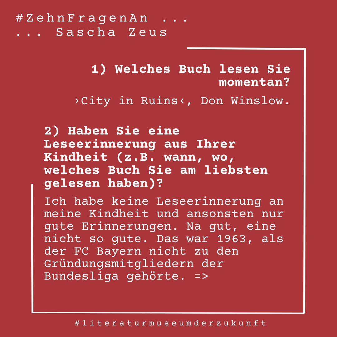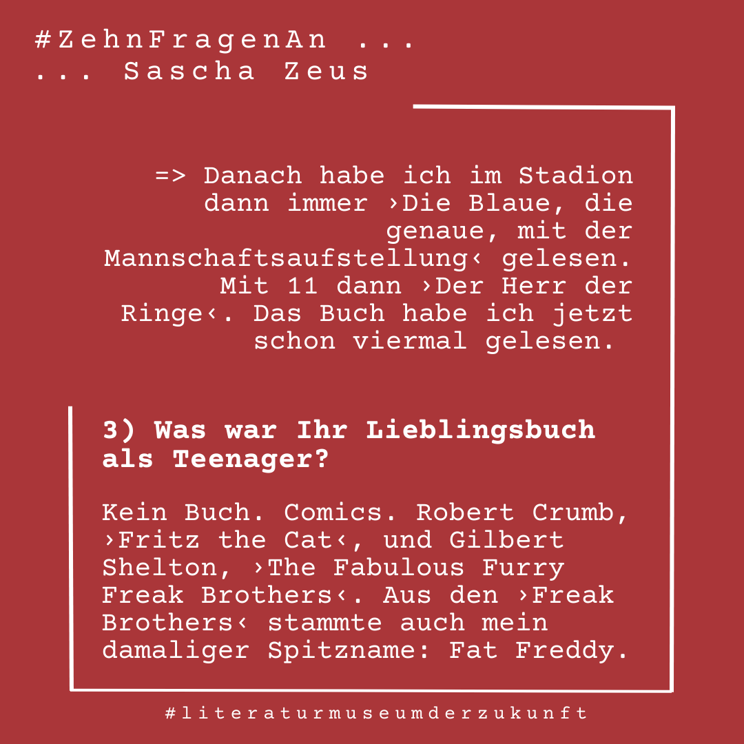 Der weißblaue Bruder von Old Plapperhand hat als Kind hauptsächlich „Die blaue, die genaue, mit der Mannschaftsaufstellung“ gelesen. Auf Michael Wirbitzkys Disney-Kenntnisse kontert er mit „Fritz the Cat“ und „The Fabulous Furry Freak Brothers“. Welches Buch haben weder Sie noch Ihre Mutter zu Ende gelesen, Herr Zeus? [SaschaZeus]