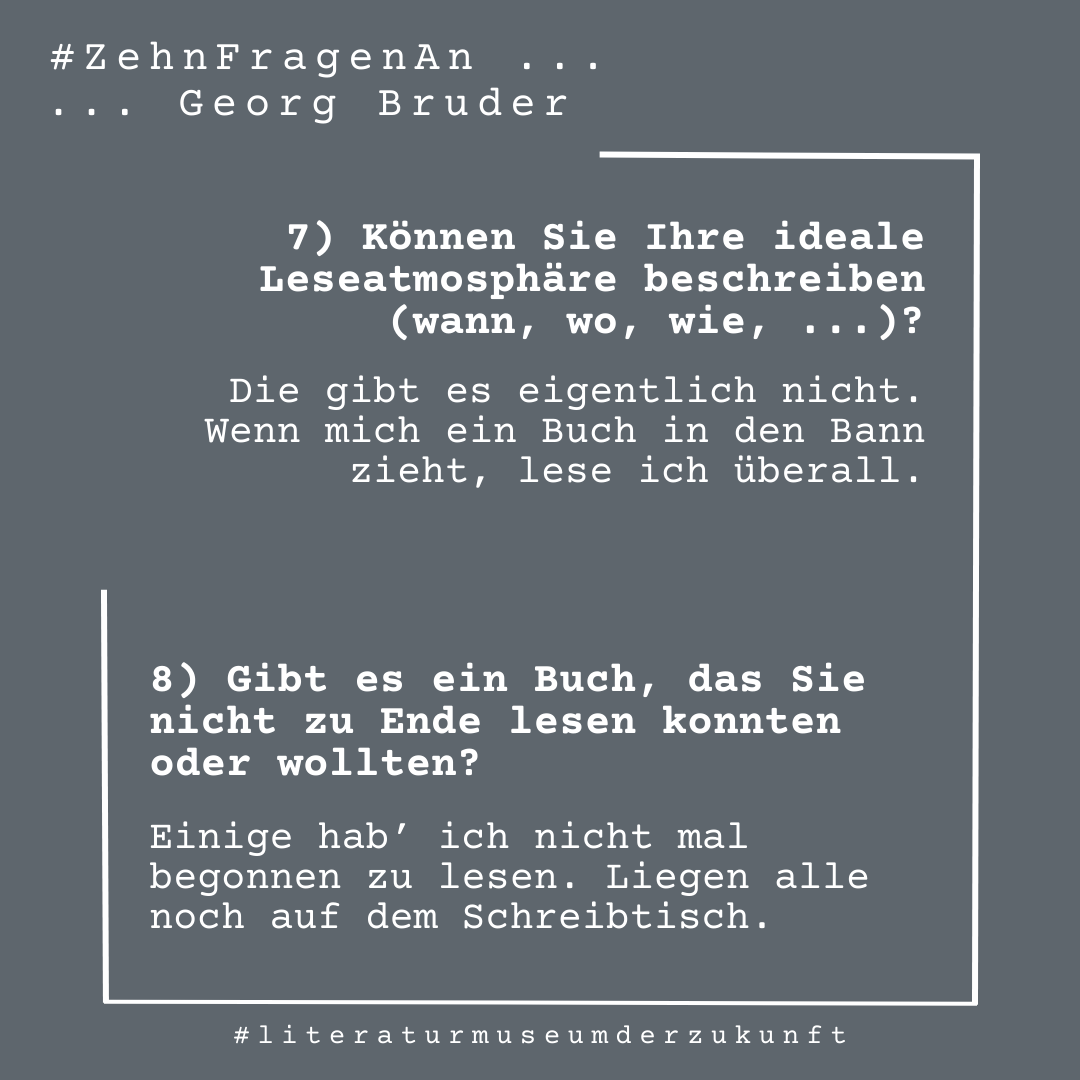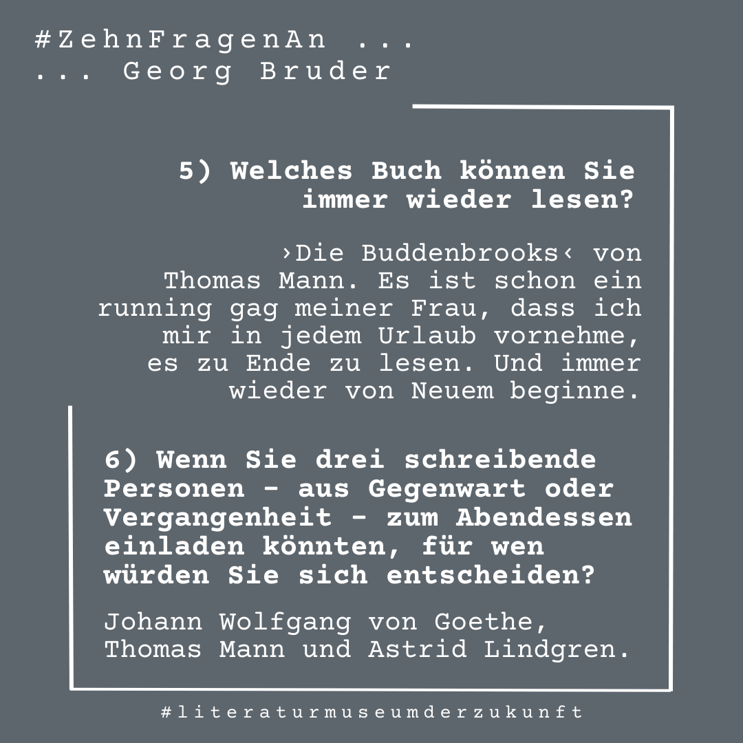 Als Anchorman der Nachrichtensendung SWR Aktuell Baden-Württemberg ist er ein bekanntes Gesicht im Südwesten. Sein Lieblingsbuch als Teenager war, genau wie bei Nils Petersen (siehe #37!), die Pflichtlektüre aus der 9. Klasse: ‚Das Parfum‘ von Patrick Süskind. Momentan ist eine andere Pflichtlektüre dran. Welche ist das, Herr Bruder? [GeorgBruder]
