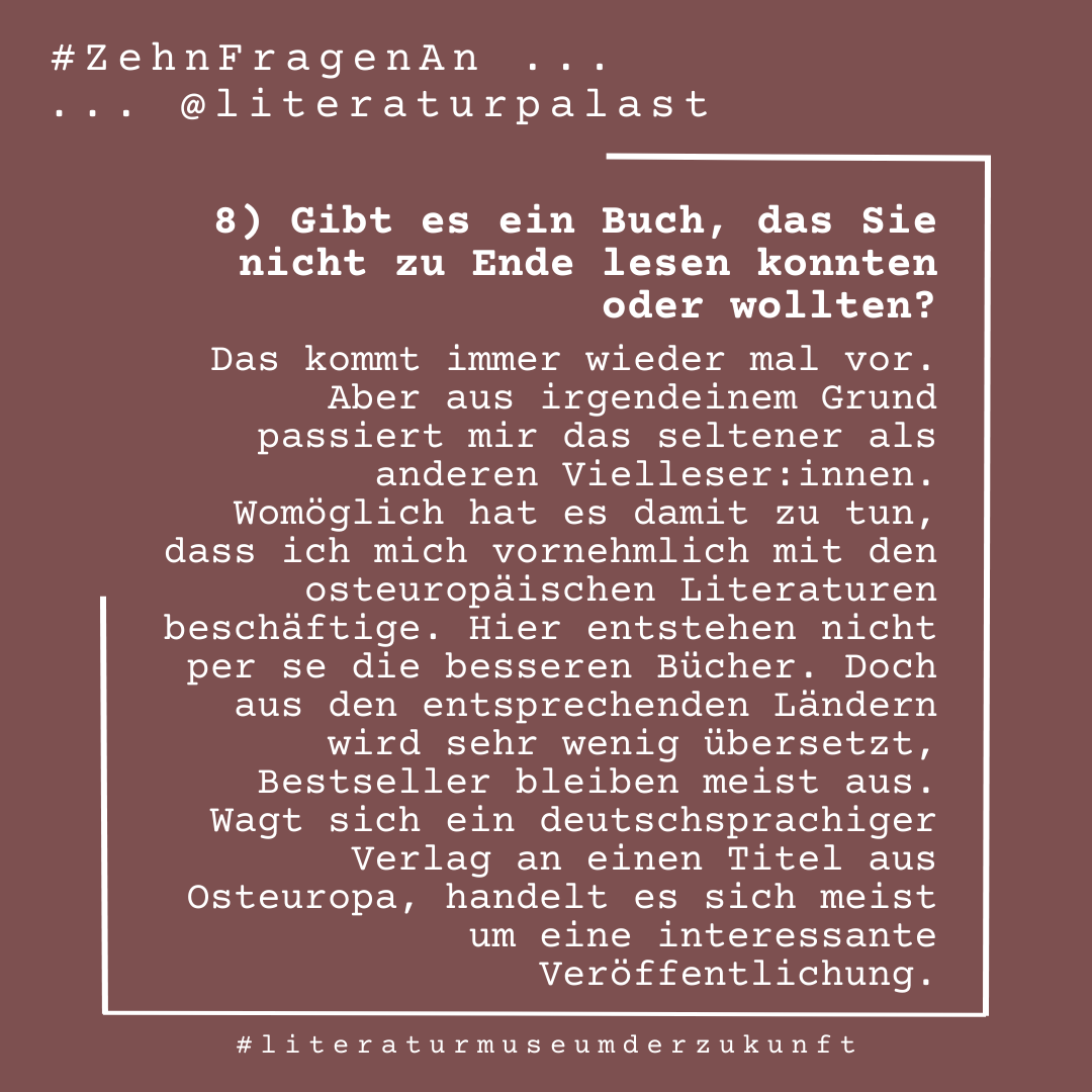 Zwischen Juryarbeit (neben der ORF-Bestenliste geht’s gerade um den Preis der Hotlist) und Festivalprogramm, Moderationen und natürlich Rezensionen – oft osteuropäischer Literaturen – für den eigenen Blog www.literaturpalast.at jetzt auch noch 10 Fragen! Welche Autorinnen und Autoren haben konkrete Lebensveränderungen bei Ihnen bewirkt, Herr Schlench? [TinoSchlench]