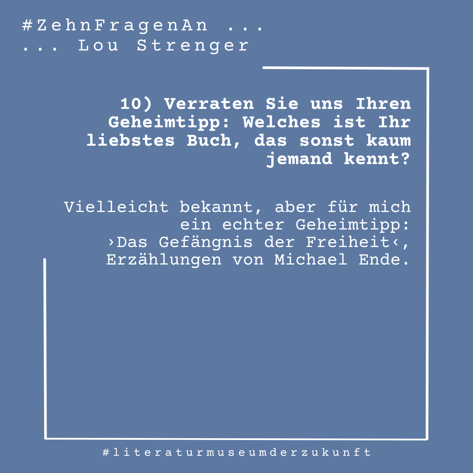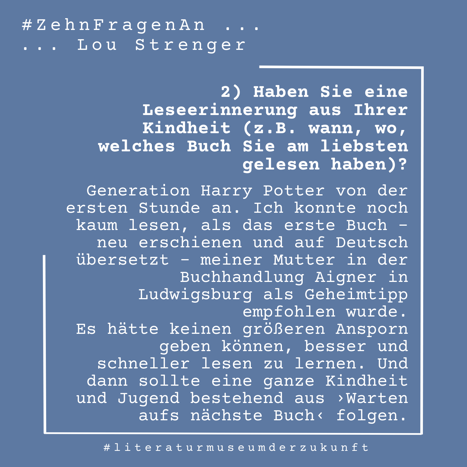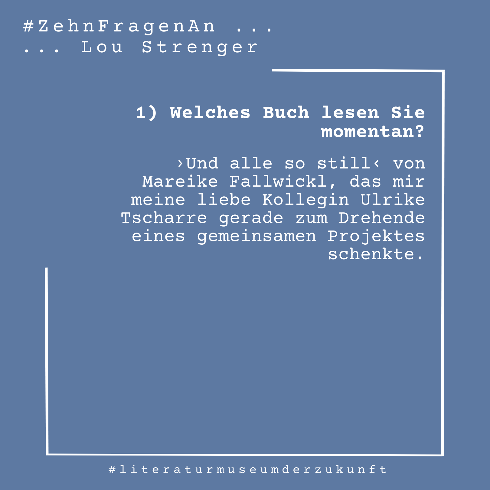 Sie war schon Helene Weigel, Polly Peachum und Sally Bowles. Und sie kommt aus der Nachbarschaft: Während ihrer Schulzeit hat sie gern Pausen auf dem Gelände des Literaturarchivs verbracht. Welches Buch hat Sie zum Lesenlernen inspiriert und was hatte die Buchhandlung Aigner in Ludwigsburg damit zu tun, Frau Strenger? [LouStrenger]