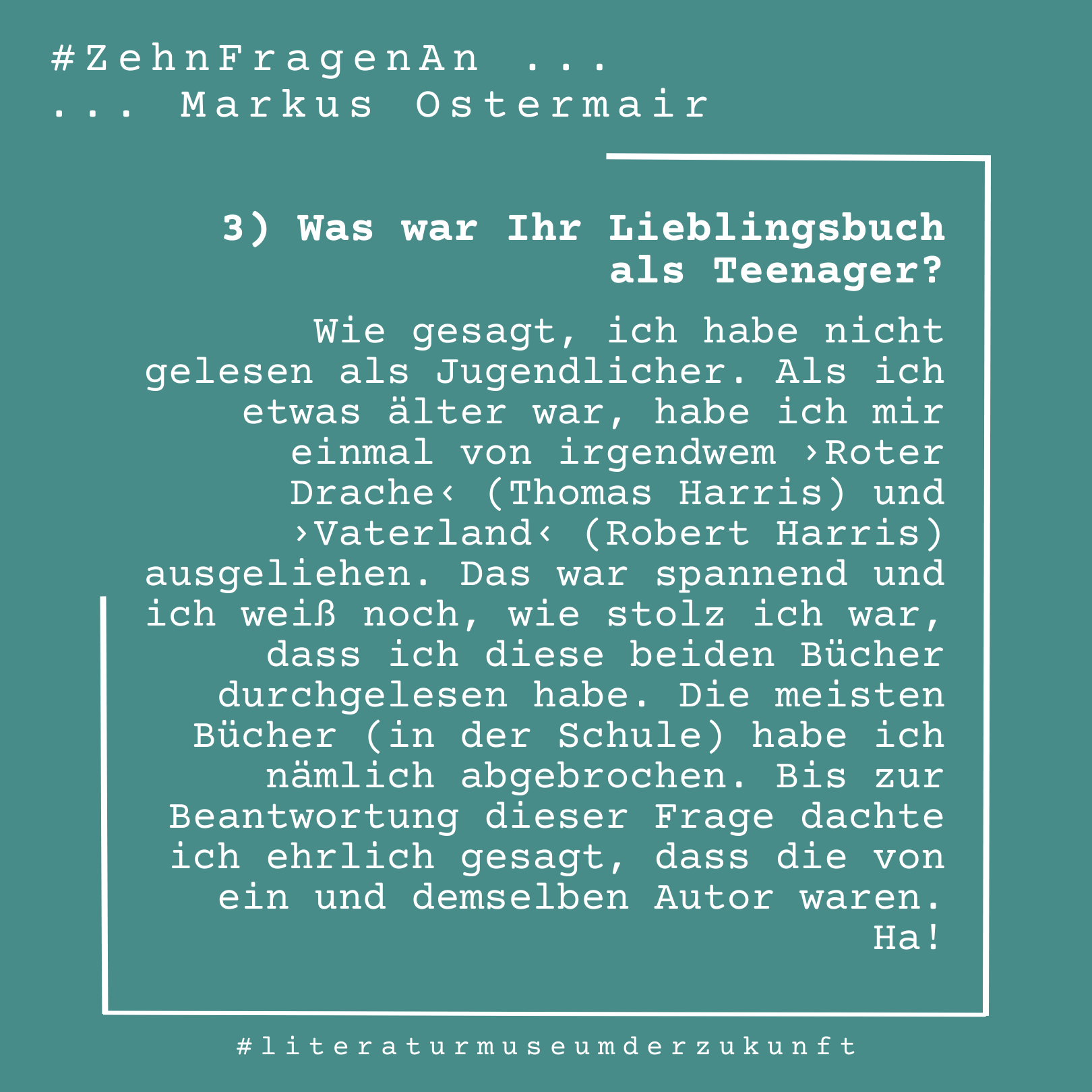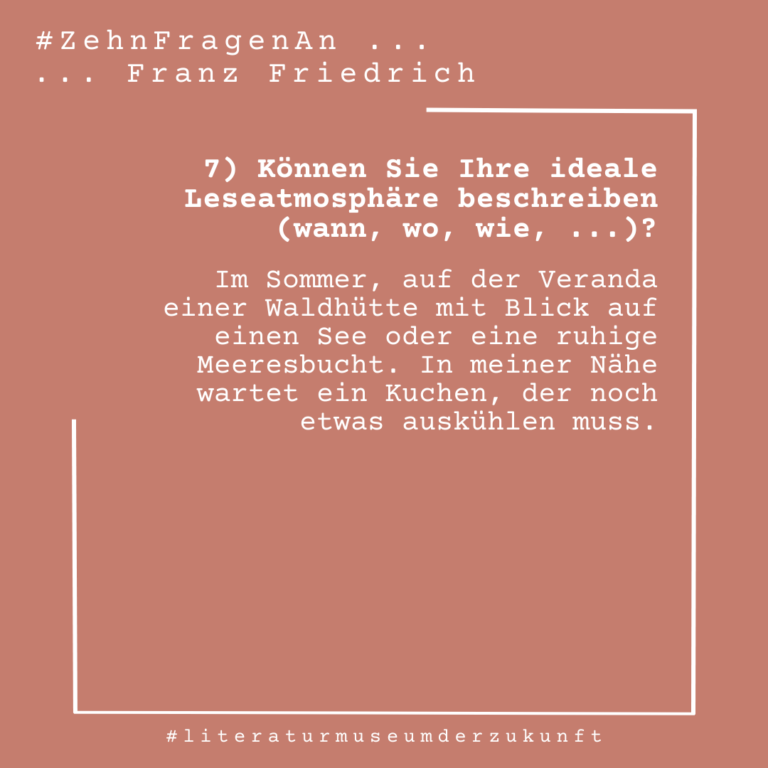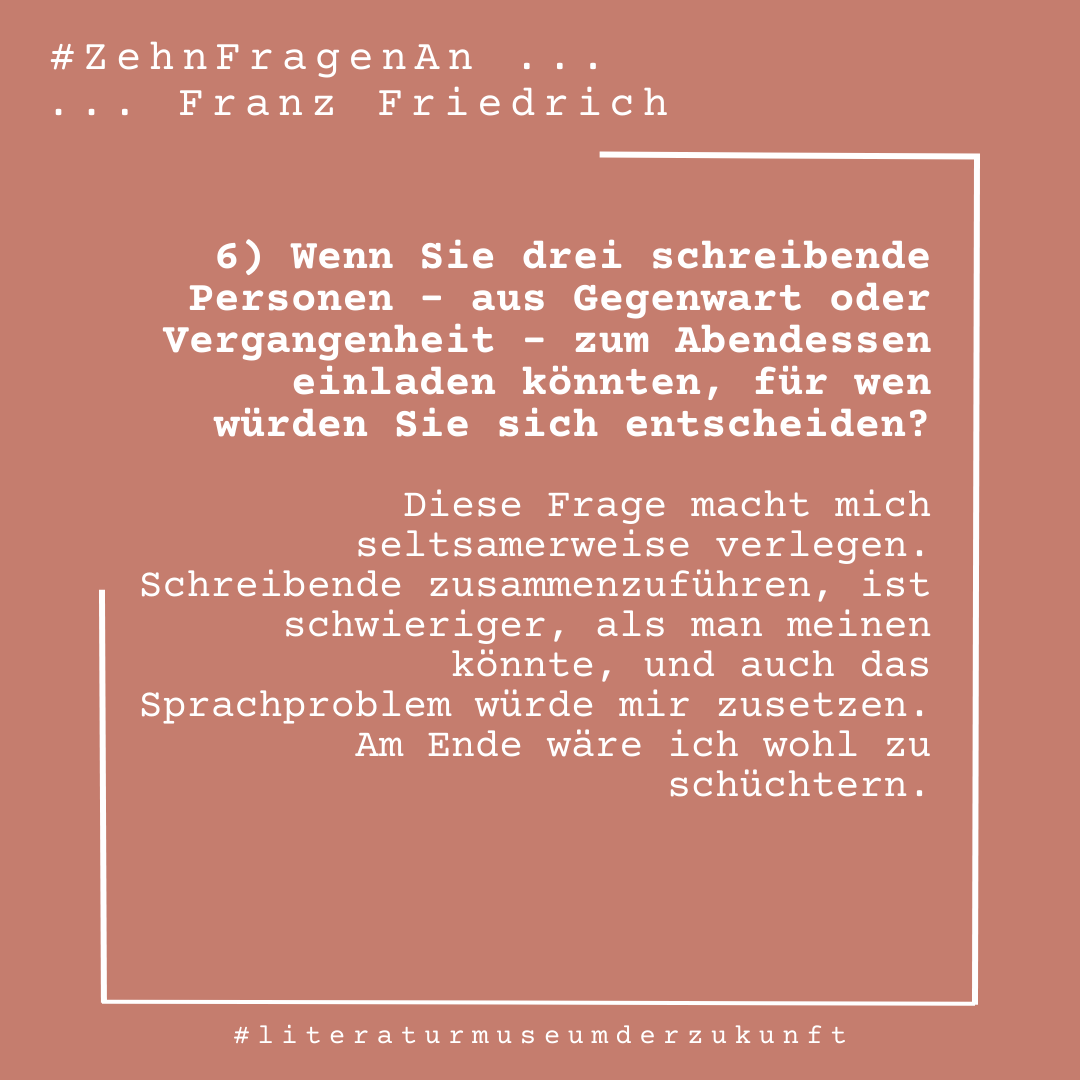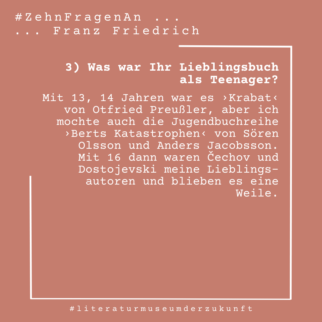 Der September startet mit der Kulturakademie! Wie jedes Jahr sind diese Woche wieder 20 Jugendliche im DLA, um an eigenen Texten zu arbeiten. Angeleitet und unterstützt werden sie dabei von Nadja Küchenmeister (siehe #9) und Franz Friedrich. Sein neuer Roman „Die Passagierin“ ist für den Deutschen Buchpreis nominiert! Sein Lieblingsbuch als Kind war kein klassisches Kinderbuch. Was war’s, Herr Friedrich? [FranzFriedrich]