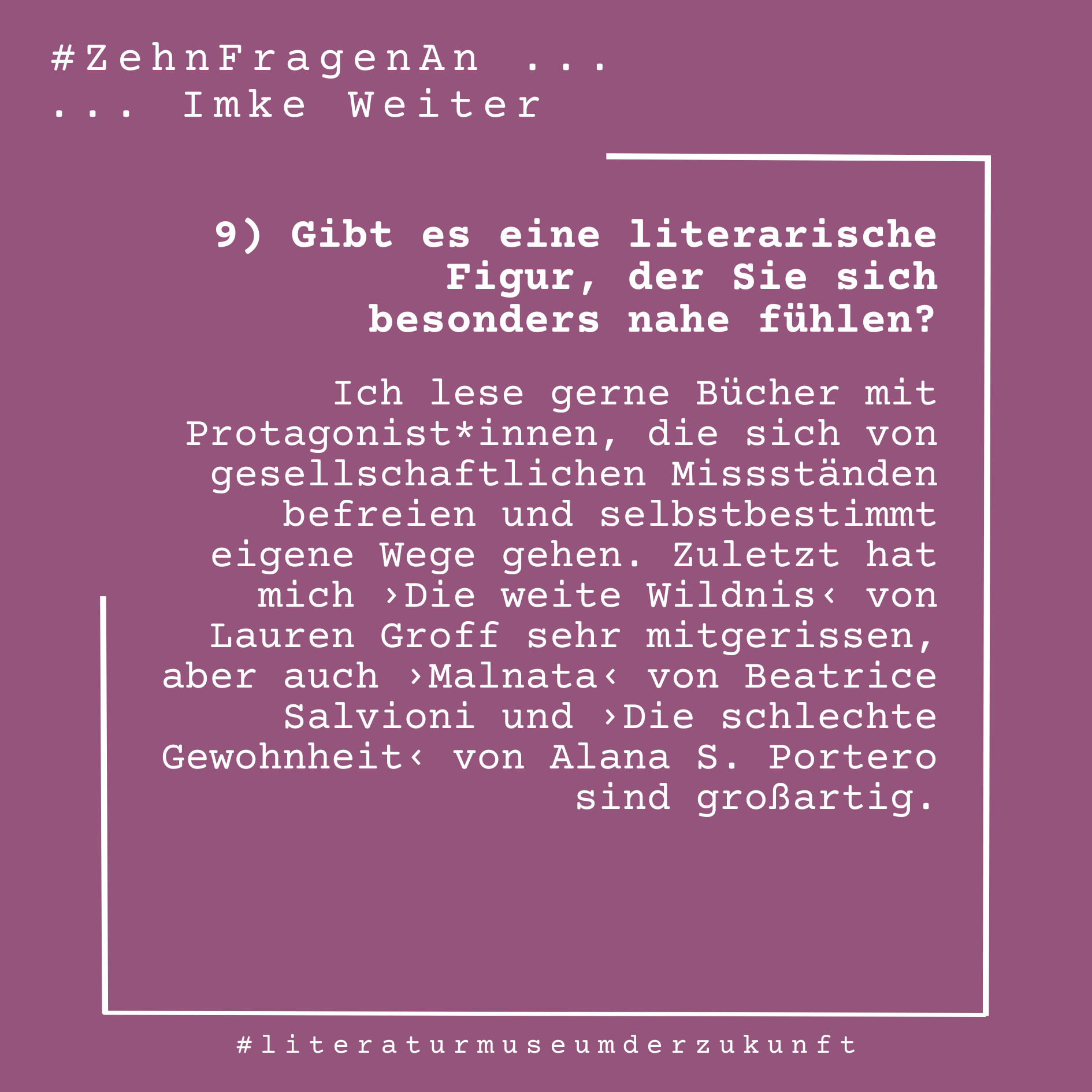 Die Vielleserin liebt literarische Figuren, die gegen gesellschaftliche Missstände protestieren. In ihrem Blogazine The_Female_Reader und auf @the_female_reader stellt sie vor allem Literatur von weiblichen und queeren Stimmen vor, immer mit einem feministischen Blick auf Bücher und Inhalte. Was sind Ihre Geheimtipps, die außerdem auf ein wichtiges Thema aufmerksam machen, Frau Weiter? [ImkeWeiter]
