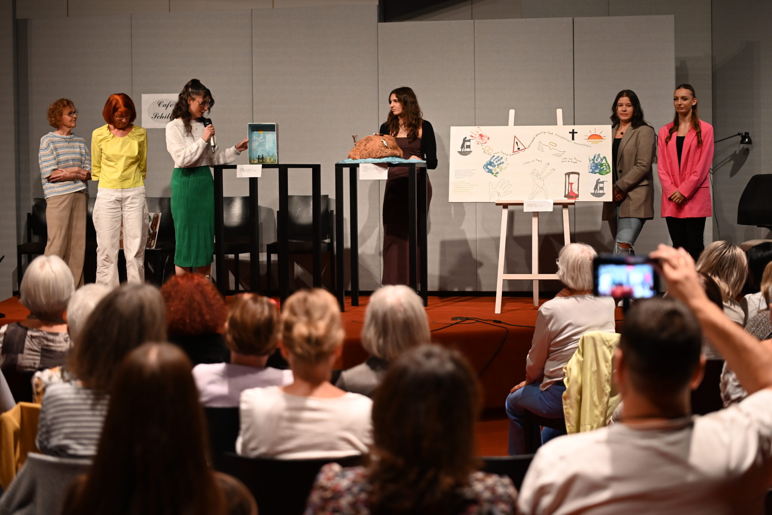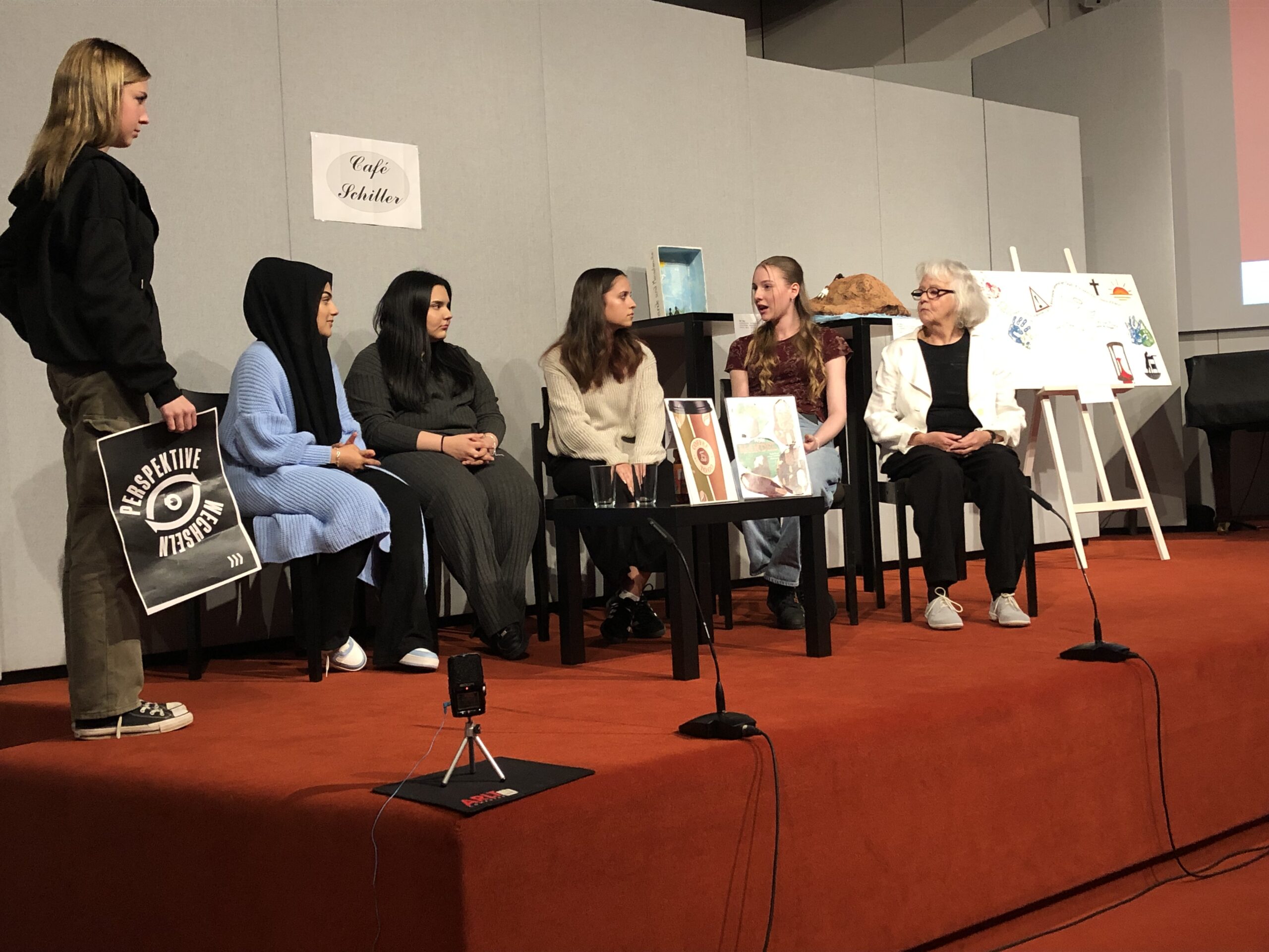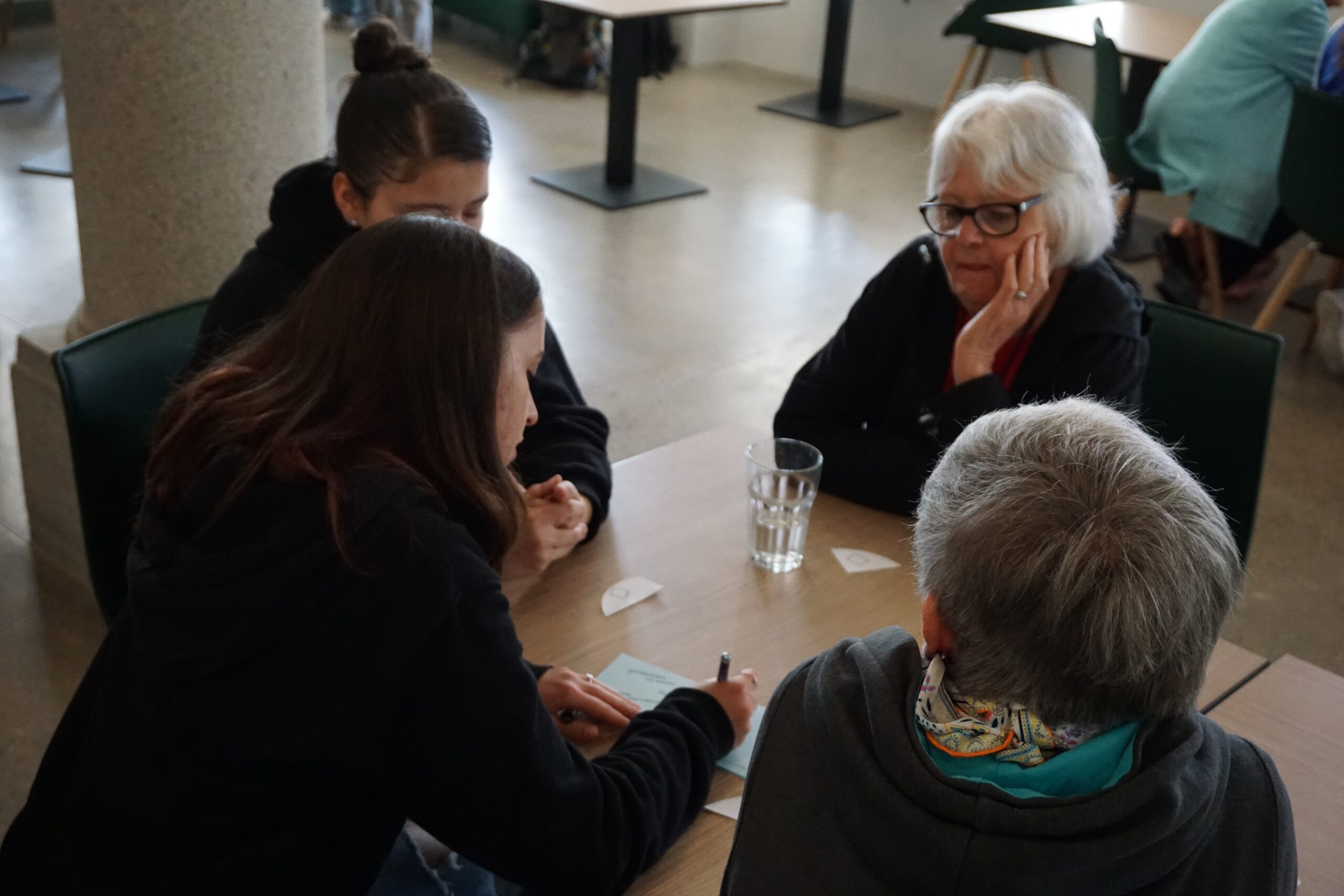 Der Gesprächskreis Philosophie des Seniorenbüros Ludwigsburg und die Schülerinnen der 9. Klasse der Anne-Frank-Realschule Marbach haben seit Mai ganze Arbeit geleistet. Und am 13. Oktober war es soweit, die Gruppen haben die kreativen Ergebnisse ihrer Zusammenarbeit im Humboldt-Saal des DLA Marbach vor zahlreichem Publikum präsentiert: Im selbstverfassten und -gespielten Mini-Drama „Perspektivwechsel“ kommt es erst zum Streit, dann zur Versöhnung zwischen Freudinnen. Video-Interviews zwischen den Generationen zeigen, durch welche Höhen und Tiefen eine Freundschaft manchmal geht und warum. Und die Kunstgruppe hat Motive und Themen aus Schillers ‚Bürgschaft‘ in bildende Kunst übersetzt.