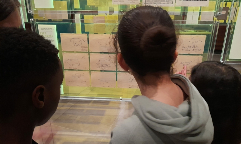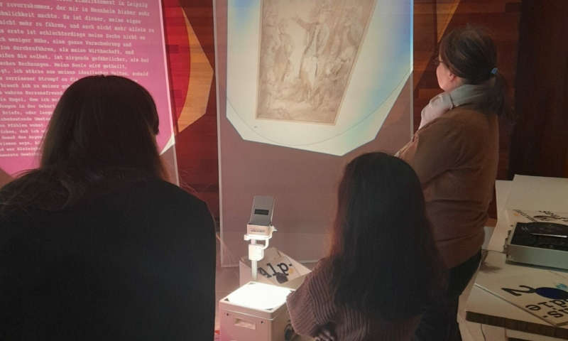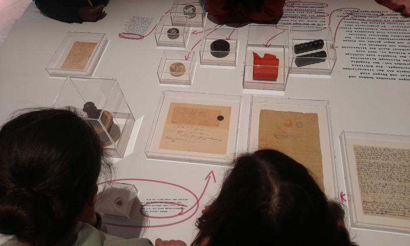 Besonders für die Mentees war der Besuch aufregend – für manche von ihnen war es der erste Museumsbesuch überhaupt. Zusammen haben wir das Museumsgebäude erkundet, die interaktiven Tische ausprobiert und uns über berühmte Menschen unterhalten, besonders über Friedrich Schiller, und über die unterschiedlichen Dinge, die man von ihnen sammeln kann. Jedes Tandem aus Mentor:in und Mentee hat sich mit einem Gegenstand Schillers beschäftigt, um ihn anschließend der ganzen Gruppe vorzustellen. Für alle, Mentees wie Mentor:innen, waren der Besuch und das Arbeiten an und mit den Objekten eine neue Erfahrung im Umgang mit Literatur, die über das gemeinsame Lesen hinausgeht. Danke, liebe Tandems, dass Ihr bei uns wart, es hat sehr großen Spaß mit Euch gemacht!