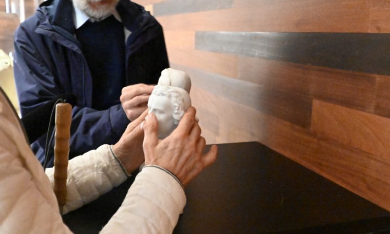 Bei einem ersten Treffen mit Herrn Winfried Specht vom Blinden- und Sehbehindertenverband Württemberg e.V. haben wir über die Akustik der Räume gesprochen und verschiedene Tastobjekte ausprobiert: eine Büste von Heiner Müller, einen reich verzierten Bucheinband und ein Springerle-Model aus Mörikes Familie. Aber wie macht man Manuskriptseiten erfahrbar?